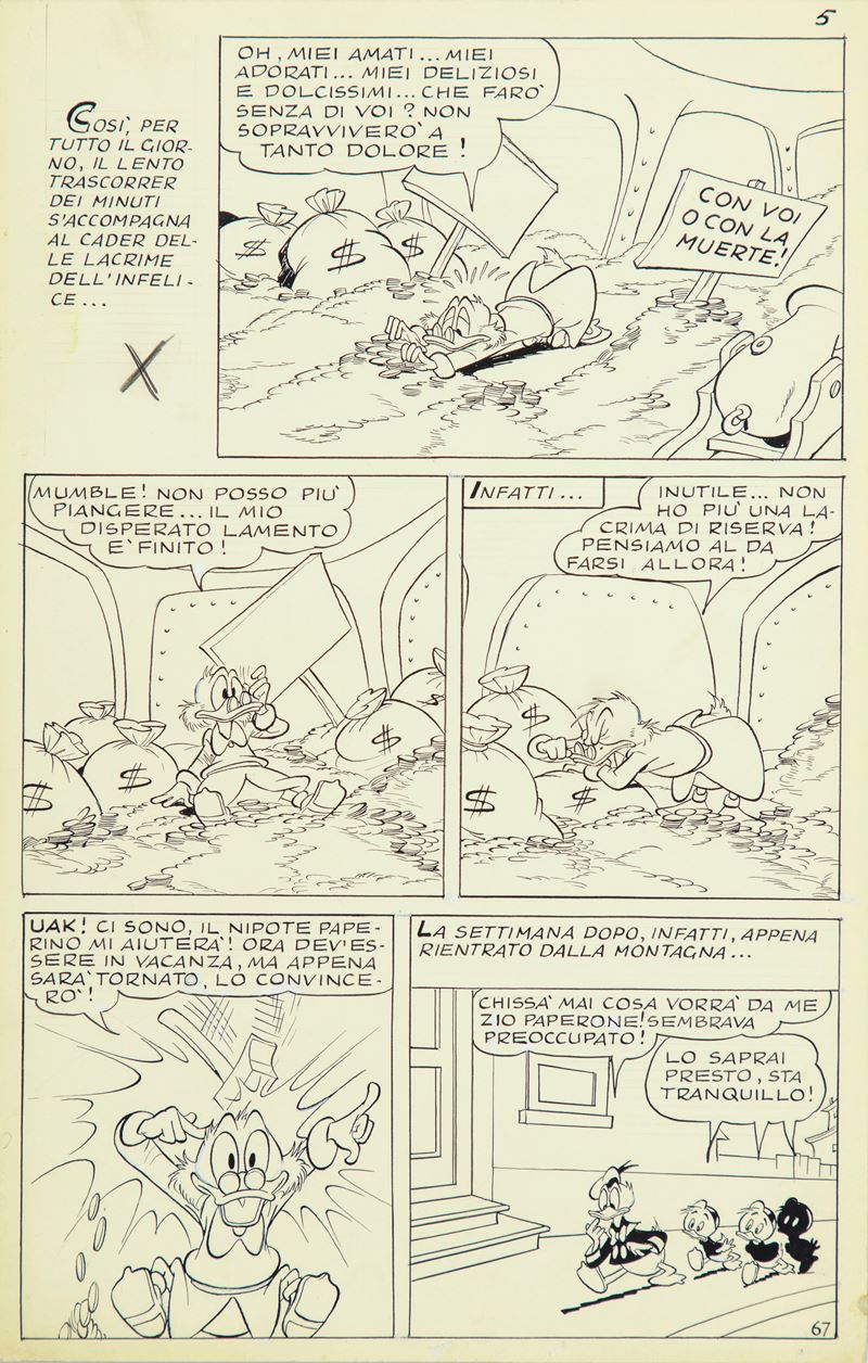 Tavola originale realizzata da De Vita per "Paperino e la muraglia dei diecimila Li", edita su Topolino n. 236 a pag. 5 nel giugno 1960. Piccola traccia di umidità al margine sinistro.