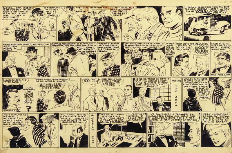 Tavola originale realizzata da Giovannini per "Jim Brady" edita su Il Vittorioso nel 1946. Personaggio nato nel '46 di spiccata ispirazione al fumetto noir statunitense. Piega verticale al centro, fori di affissione e piccole mancanze ai margini. Acquerellata al retro.