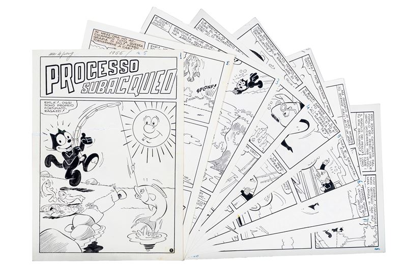 Storia completa composta da 8 tavole originali realizzate da Dossi per "Processo subacqueo", edita su Gatto Felix n. 5 nel 1965. Prima storia in assoluto di Felix da essere disegnata da Dossi. Firmata al retro di ogni pagina.