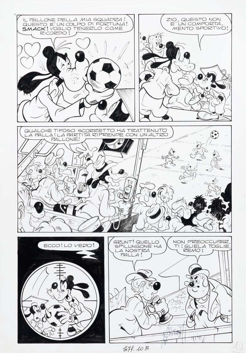 Tavola originale realizzata da Asteriti per "Gilberto e il tifo scientifico", edita su Topolino n. 1479 a pag. 10 nell'aprile 1984. Firmata.