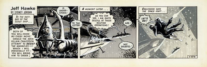 Striscia giornaliera n. H 2278 del 25/07/1961 per "Jeff Hawke". La serie che ha come protagonista Jeff Hawke venne creata da Sydney Jordan nel 1955, il quale si ispirò alla sua esperienza di pilota nella R.A.F., Royal Air Force, per creare i fantascientifici veicoli spaziali della serie. Firmata, titolata e datata al retro.