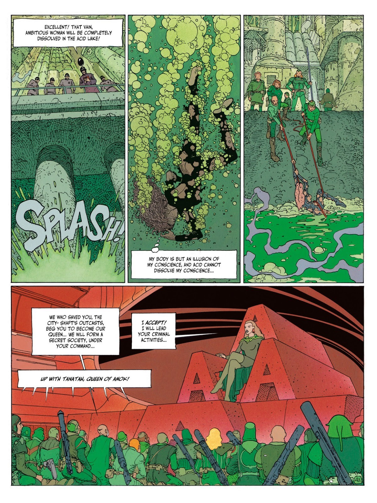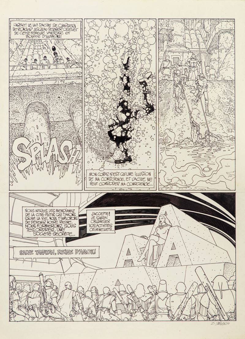 Tavola originale realizzata da Janjetov per "Suicide allée", edita su Avant l'Incal n. 6 a pag. 42 da Les Humanoides Associés nel 1995. Testi di Alejandro Jodorowsky. Su due pannelli. Piccolo strappo al margine sinistro. Firmata.