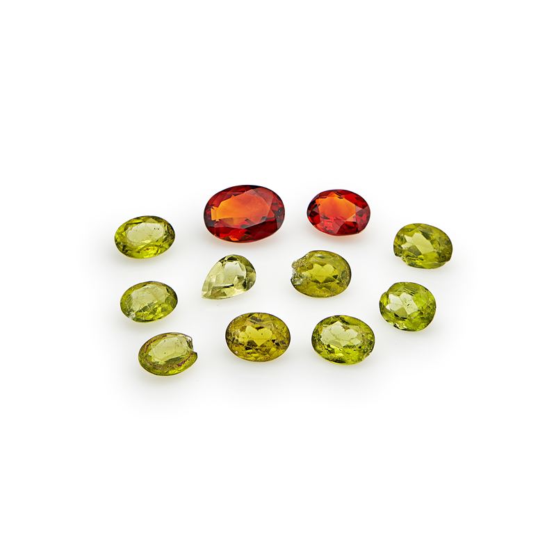 peridoti e crisoberillo di forma ovale e a goccia, taglio sfaccettato, per totale ct 16,52, difetti (alcuni presentano rotture e mancanze), due quarzi di forma ovale, taglio sfaccettato, per totale ct 6,70.