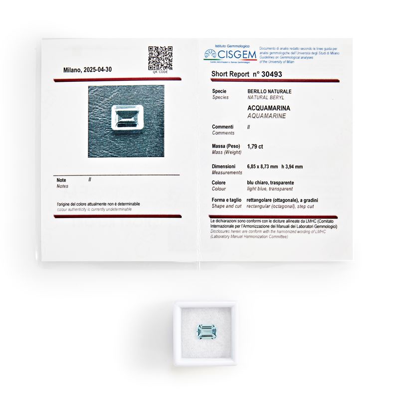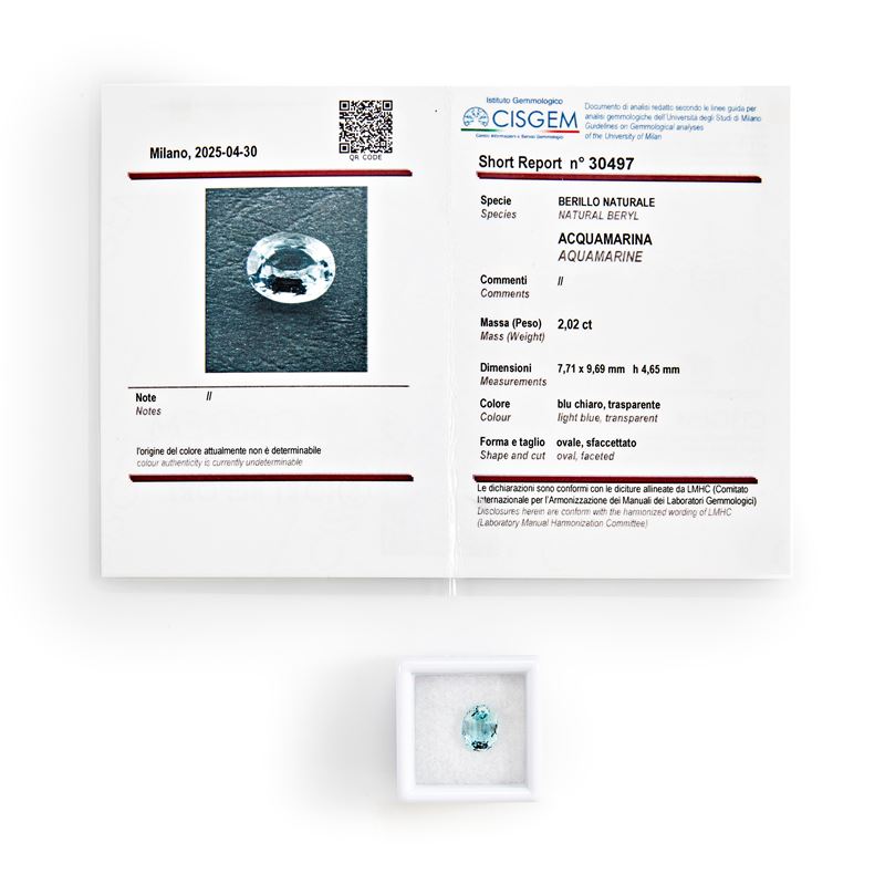 Le acquemarine sono accompagnate da short report n. 30493 del 30/04/2025; n. 30494 del 30/04/2025, n. 30495 del 30/04/2025 e n. 30497 del 30/04/2025 CISGEM, Milano.