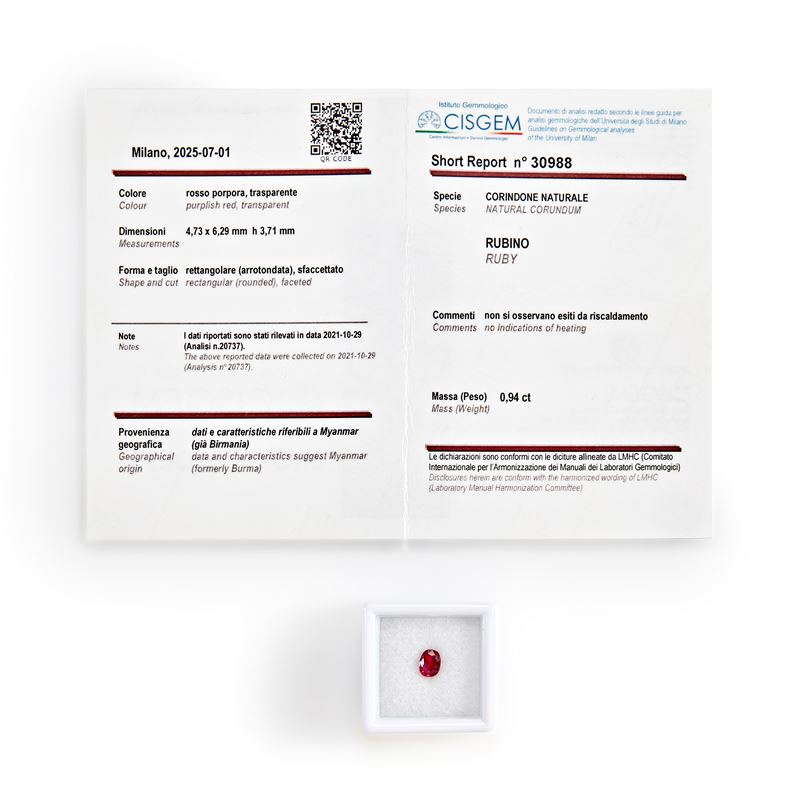 Il rubino è accompagnato da short report n. 30988 del 01/07/2025 CISGEM, Milano, e analisi verbale n.20737.