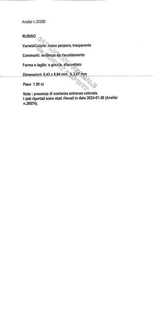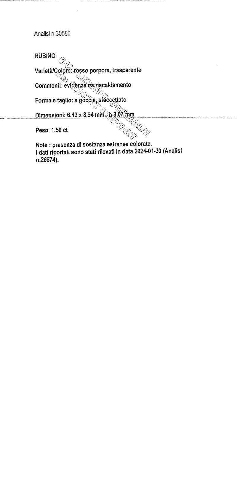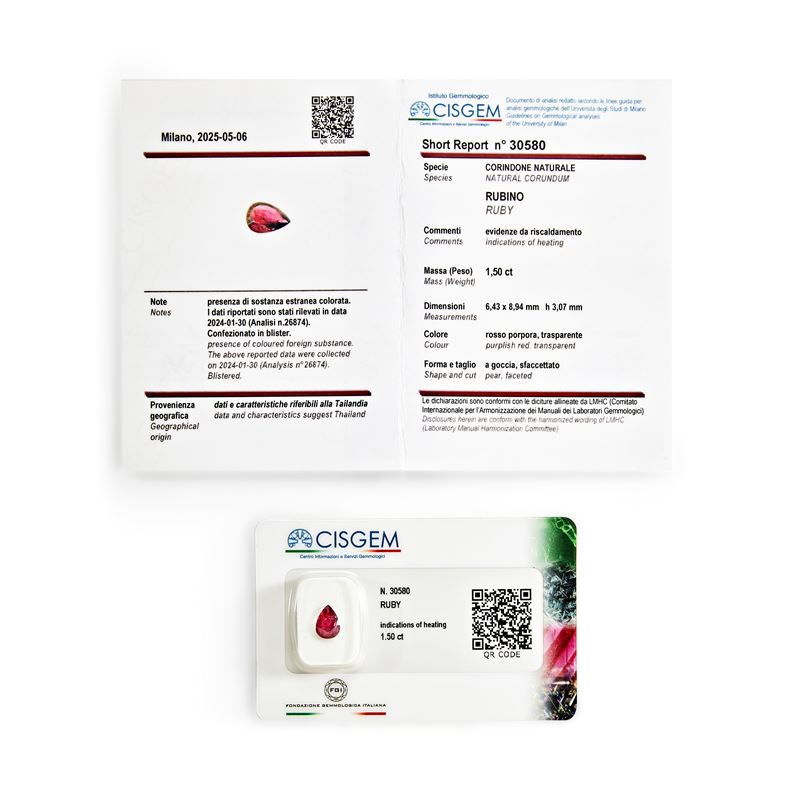Il rubino è accompagnato da short report n. 30580 del 06/05/2025 CISGEM, Milano, e analisi verbale n.26874.