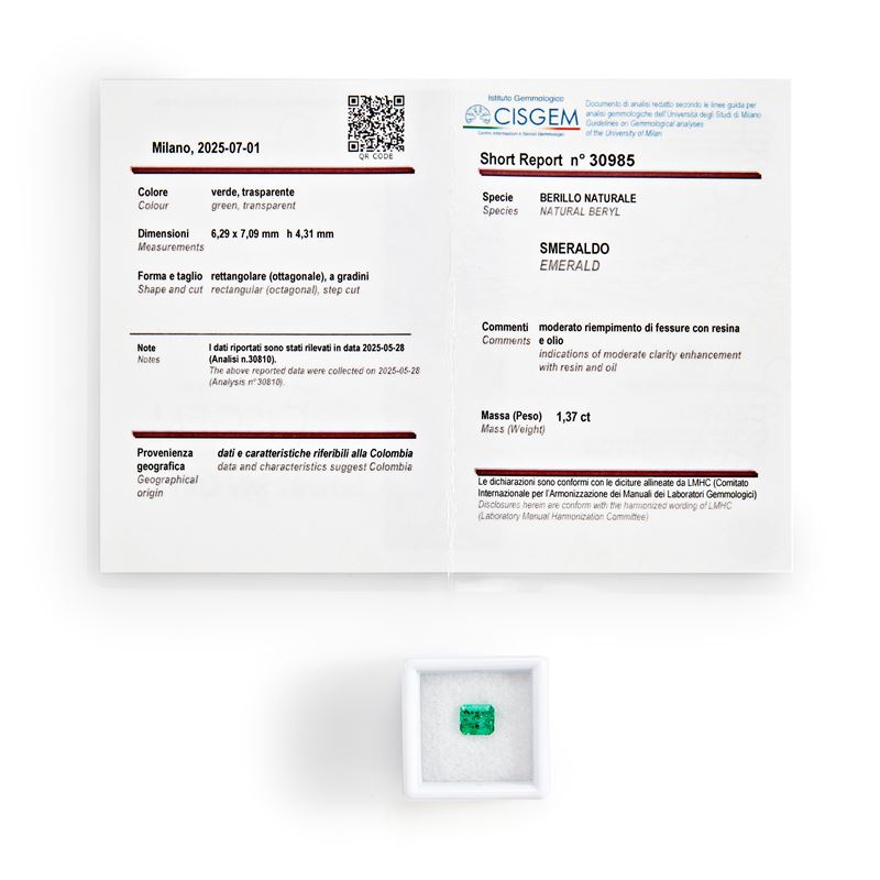 Lo smeraldo è accompagnato da short report n. 30985 del 01/07/2025 CISGEM, Milano, e analisi verbale n.30810.
