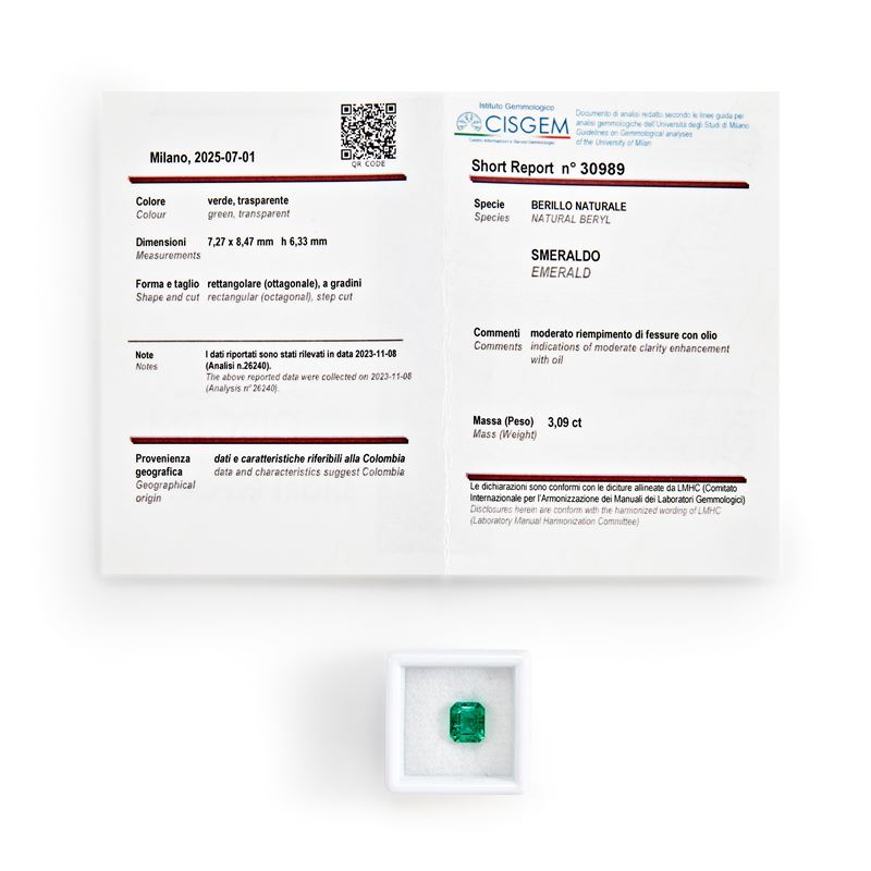 Lo smeraldo è accompagnato da short report n. 30989 del 01/07/2025 CISGEM, Milano, e analisi verbale n.26240.