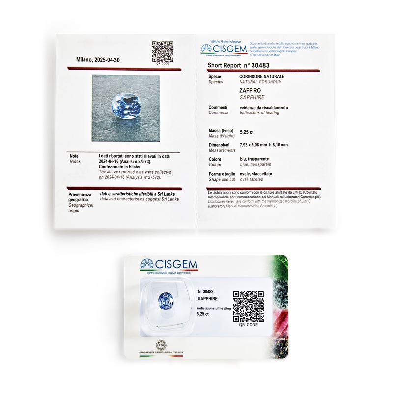 Lo zaffiro è accompagnato da short report n. 30483 del 30/04/2025 CISGEM, Milano, e analisi verbale n.27573.