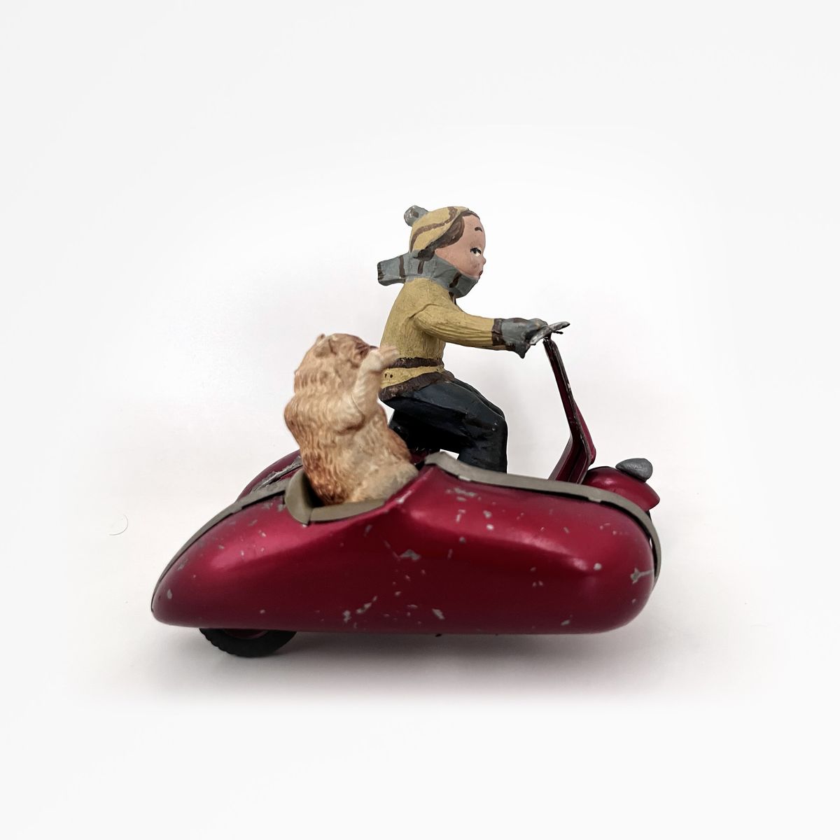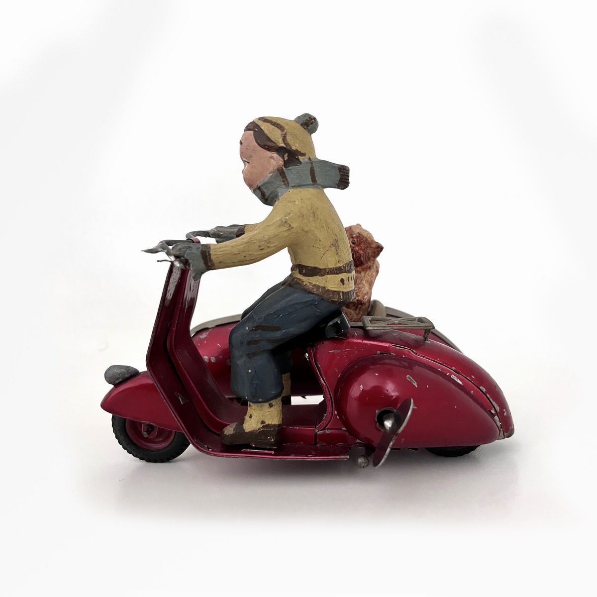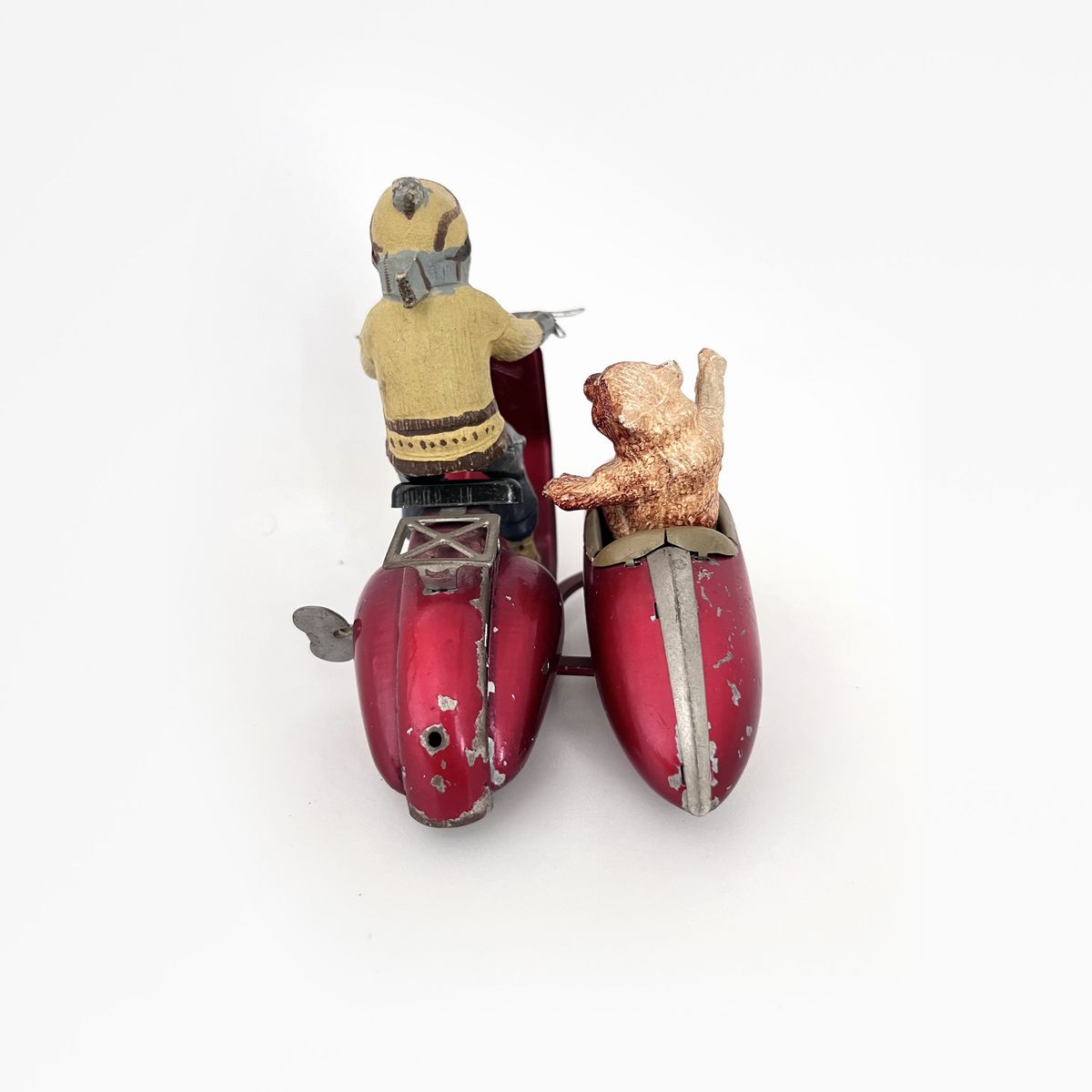 Rara vespa con sidecar in latta, pilota e orso passeggero, funzionamento a molla