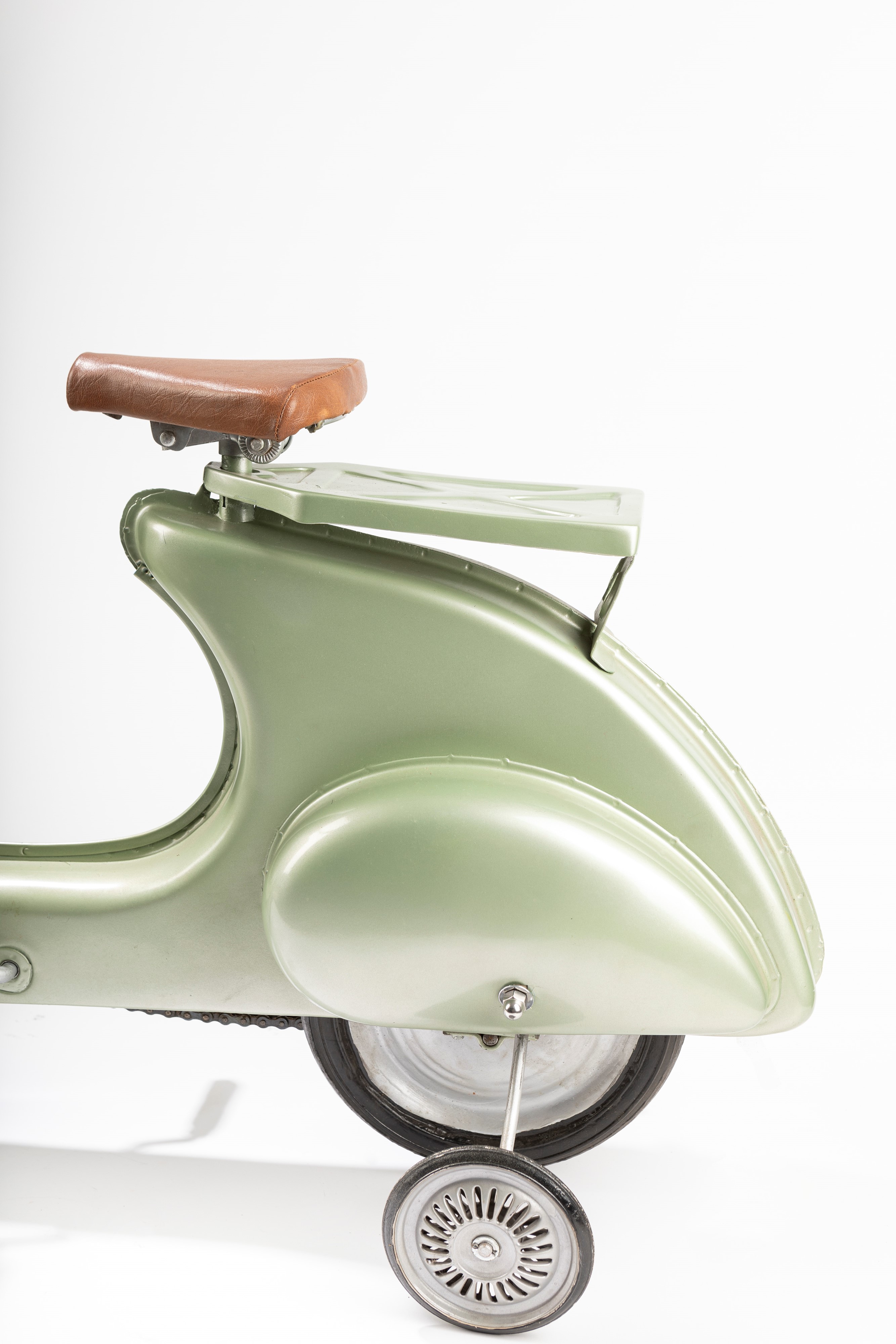 Modellino a pedali in metallo verniciato con trazione a catena, rotelle posteriori stabilizzanti rimovibili, sella ricoperta in pelle e porta pacchi in metallo.