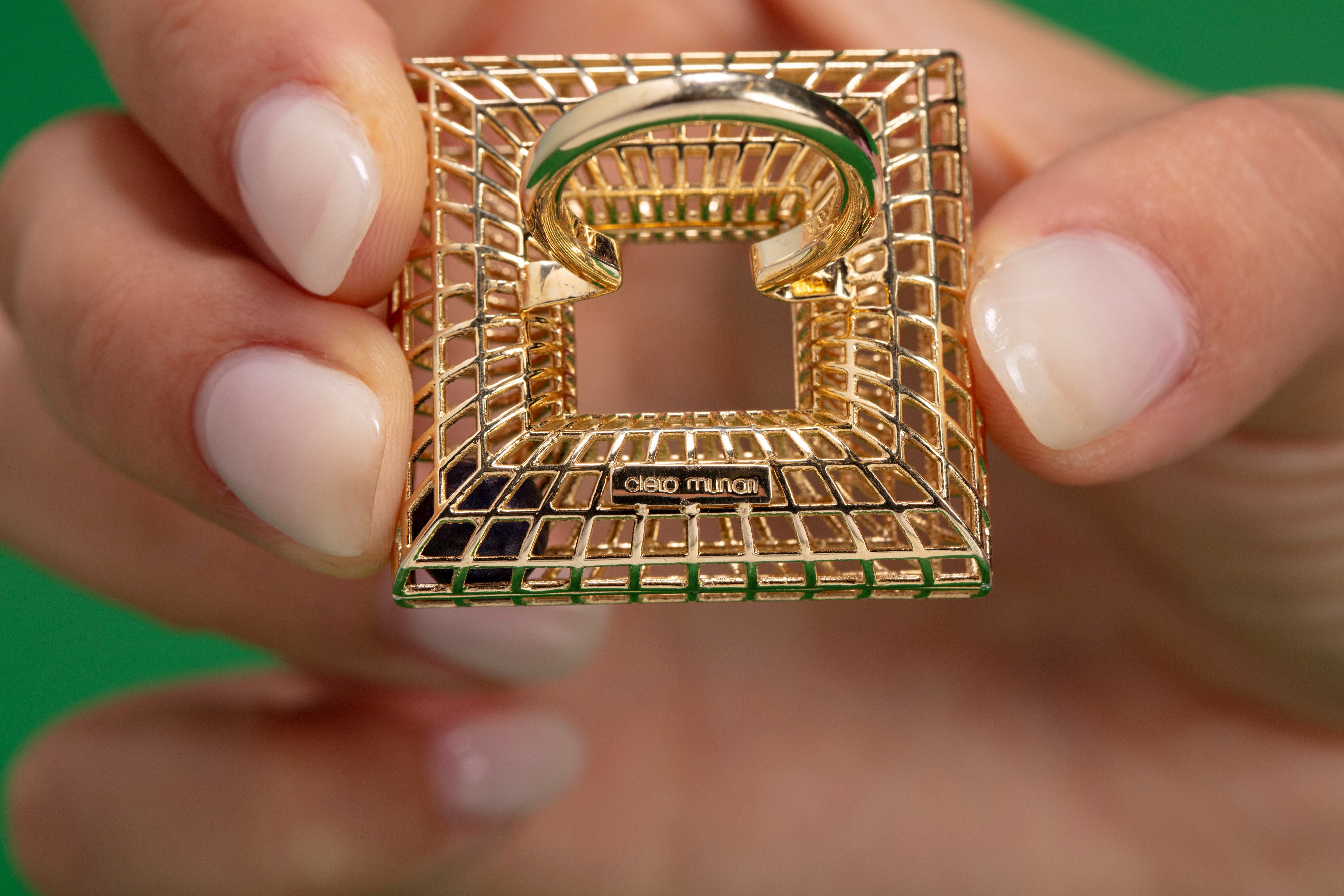 in argento 925dorato, a gabbia quadrata contenente sfera nera, firmato e punzonato.