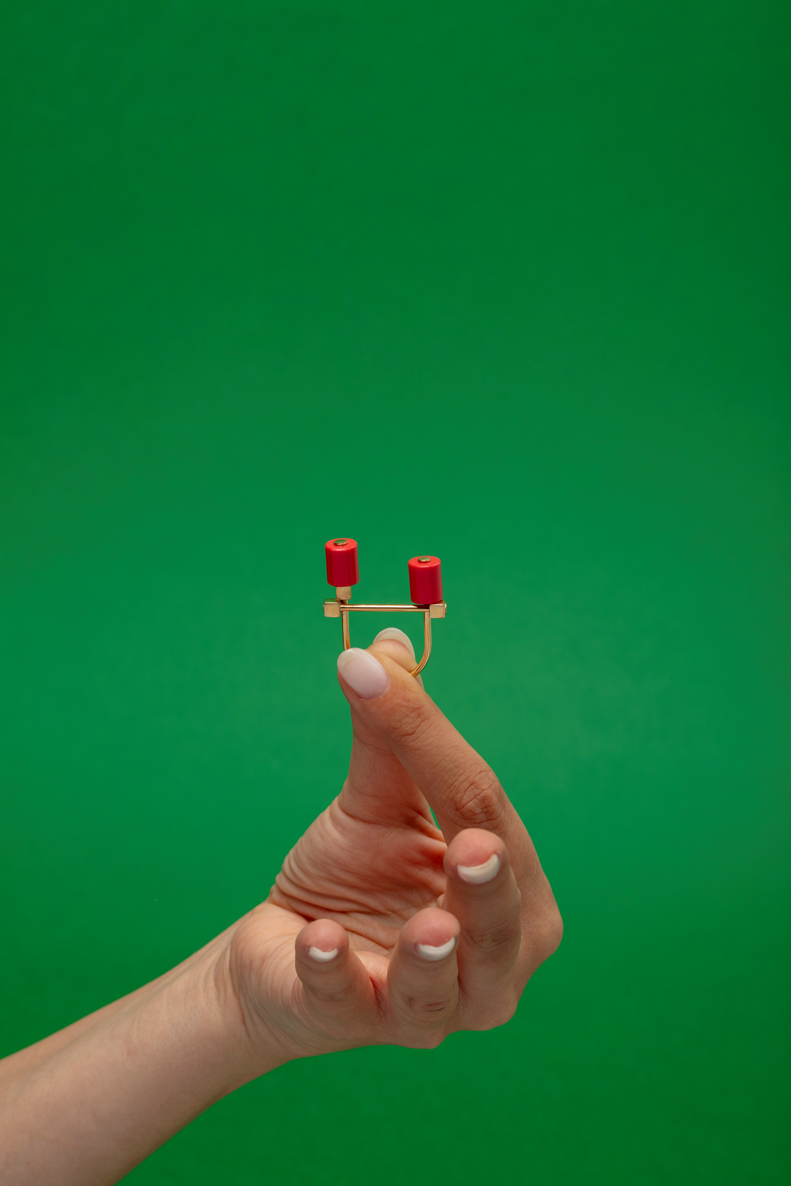 in argento 925dorato, con due elementi cilindrici in pasta di corallo, firmato e punzonato.