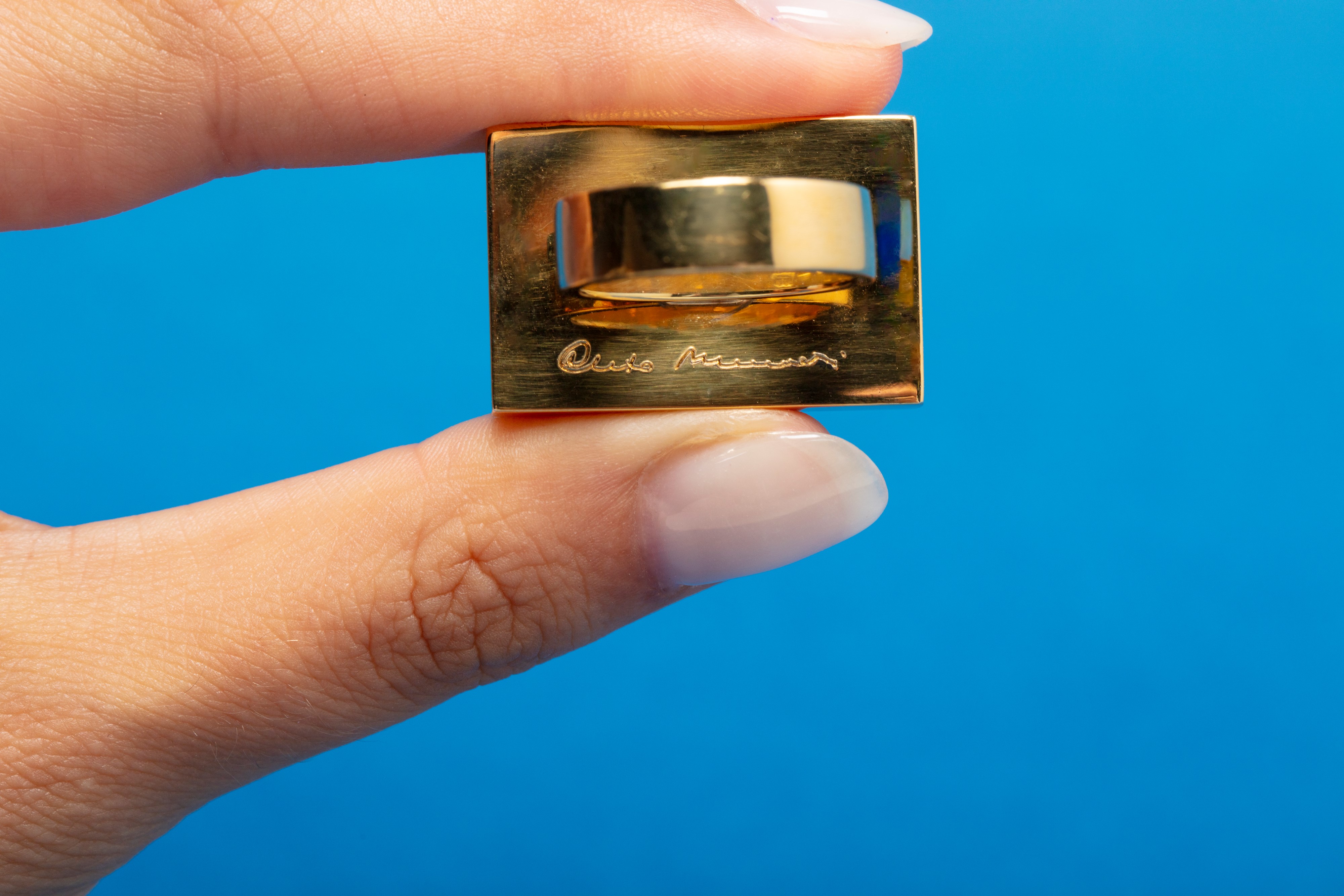 in argento 925dorato, con mani che trattengono cilindro in onice, firmato e punzonato.