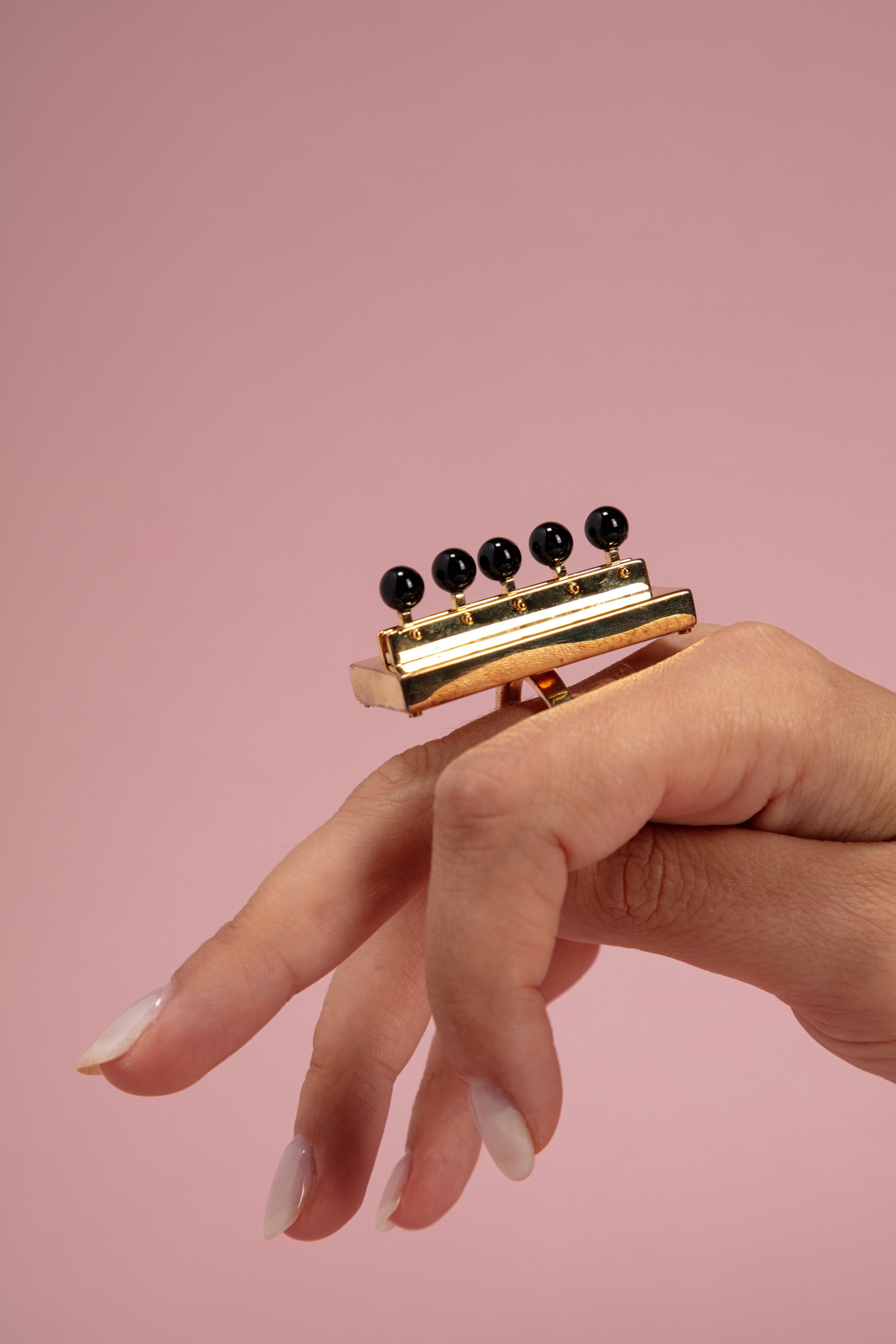 in argento 925dorato, con cinque sfere mobili in onice, firmato e punzonato.