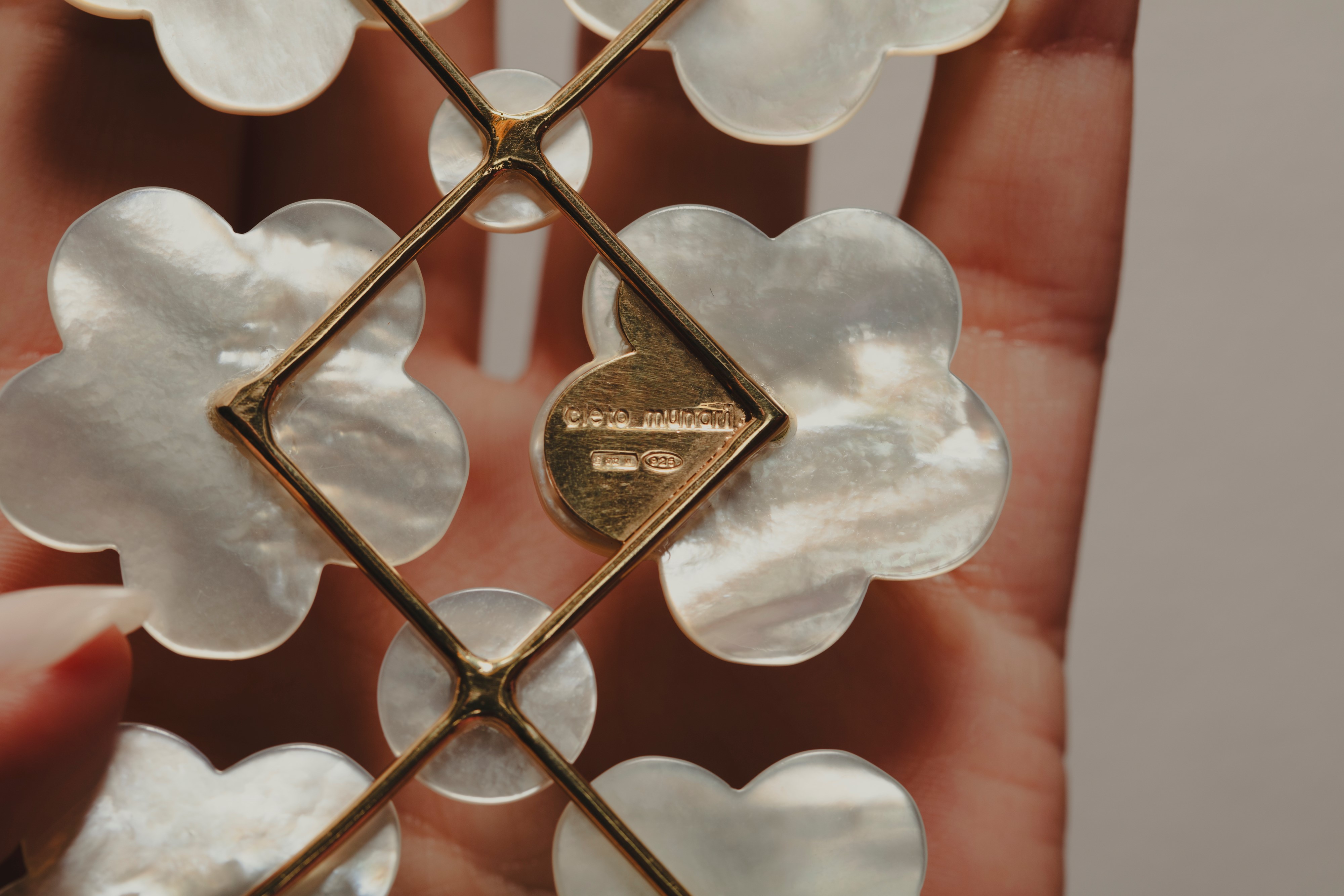 in argento 925dorata, con fiori in madreperla e crisoprasio verde, firmata e punzonata.