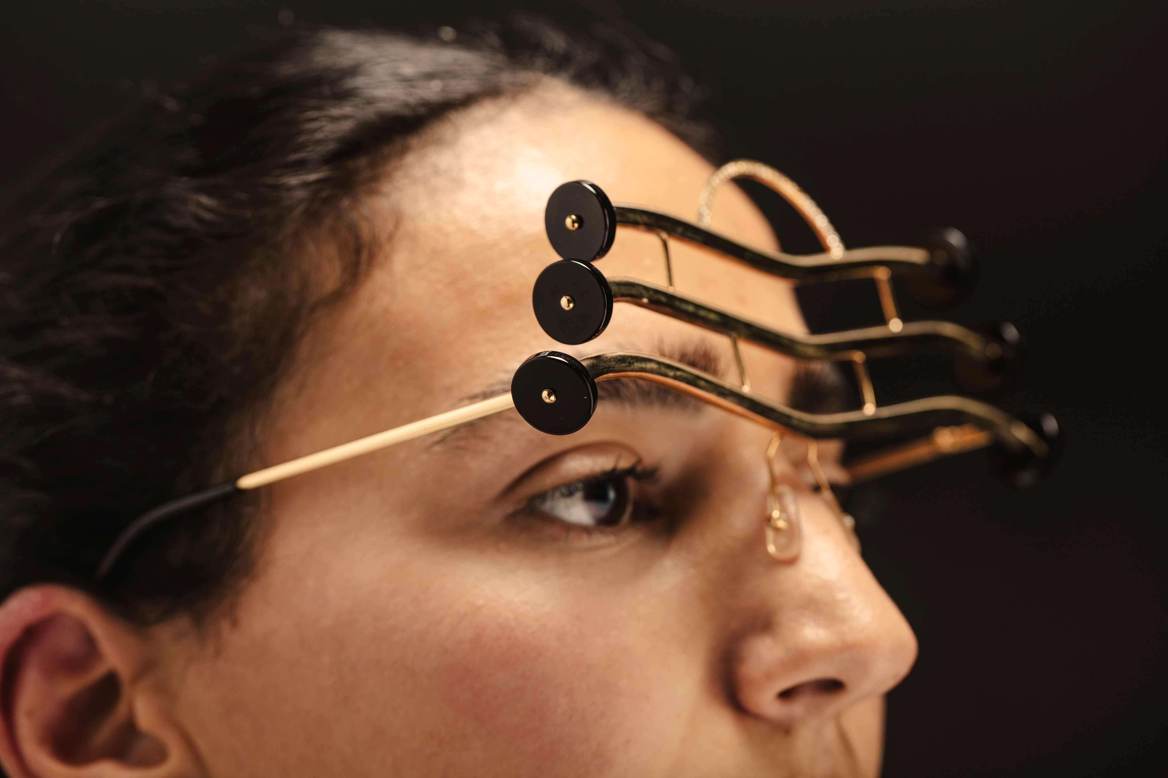 in argento 925dorati, ornamento da fronte, con dischi in onice e zirconi taglio brillante, firmati e punzonati, difetti (una pietra mancante).