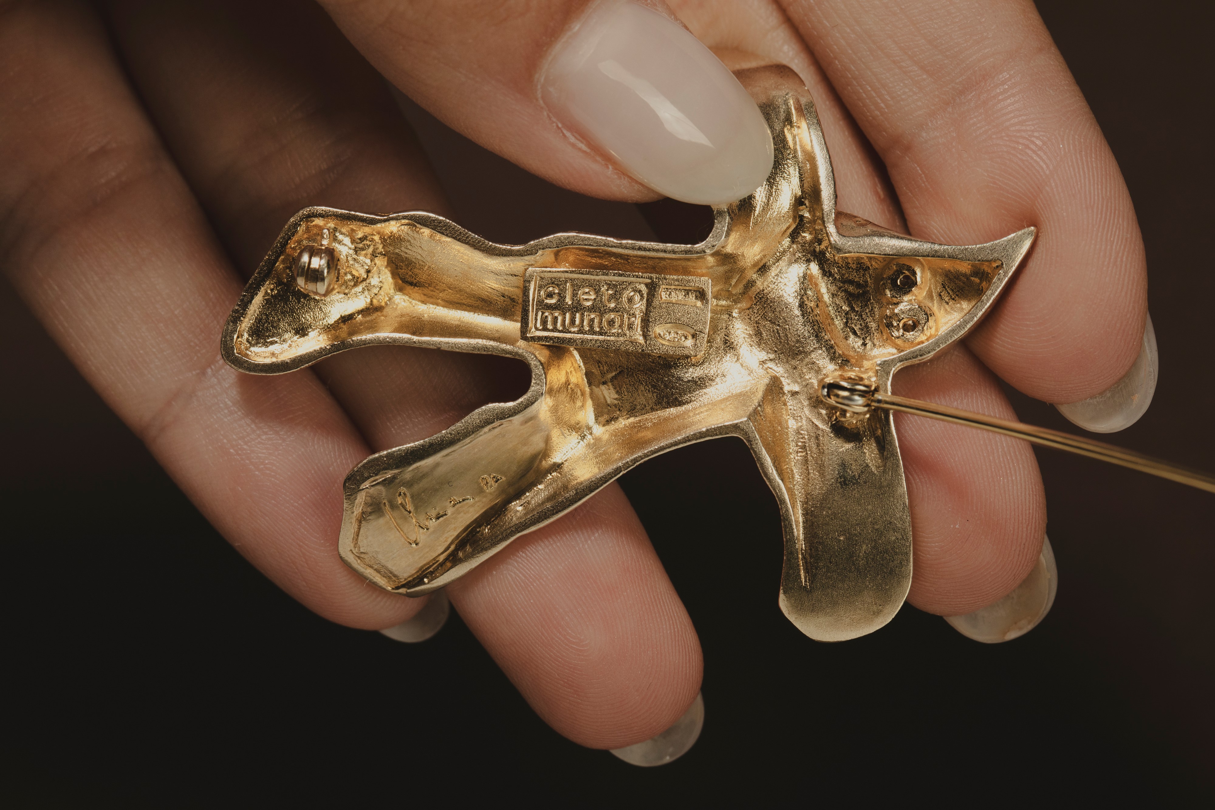 in argento 925dorata, fantasmino con zirconi taglio brillante agli occhi, firmata e punzonata.