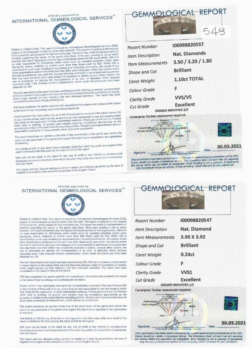 in oro bianco 18K e diamanti taglio brillante per totale ct 1,34 circa, prob. colore F, purezza VVS/VS, a riviere.
