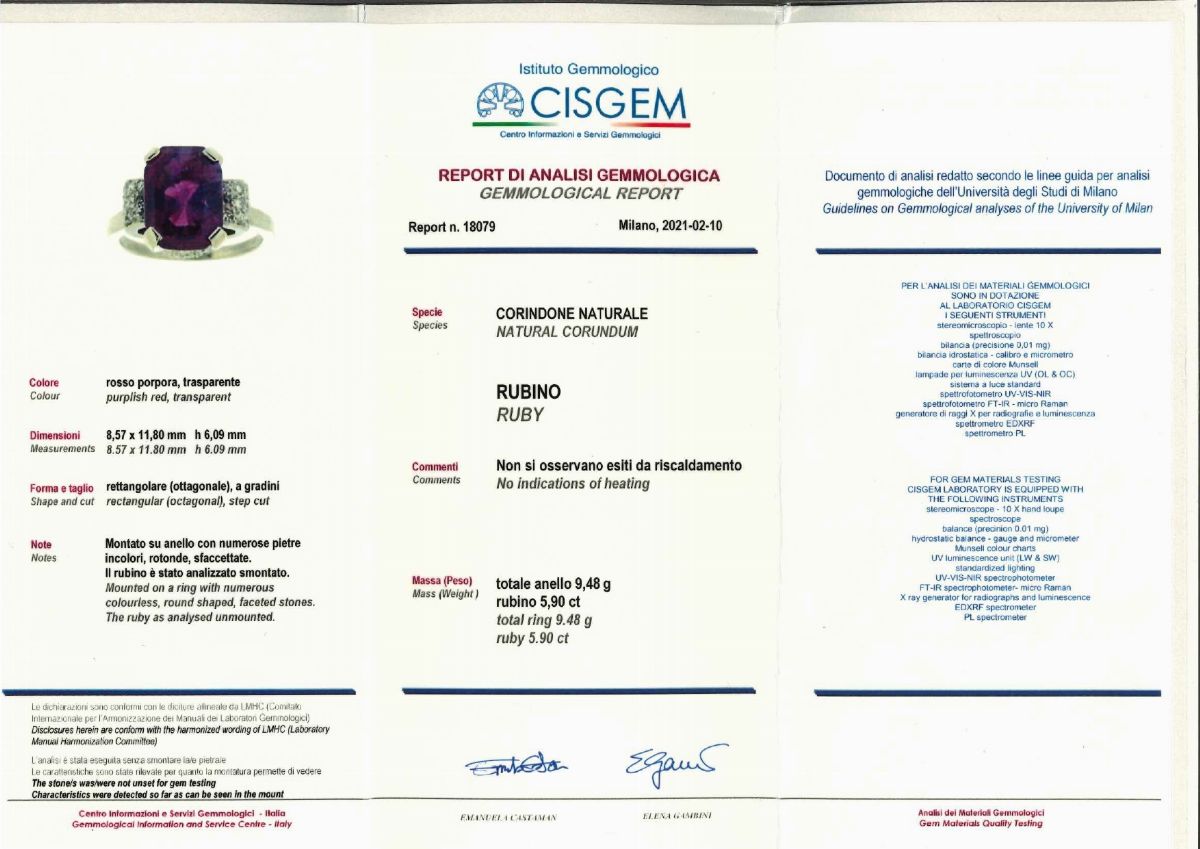L'anello è accompagnato da certificato gemmologico n. 18079 del 10/02/2021, CISGEM Milano. Attestante che il rubino non ha esiti da riscaldamento.