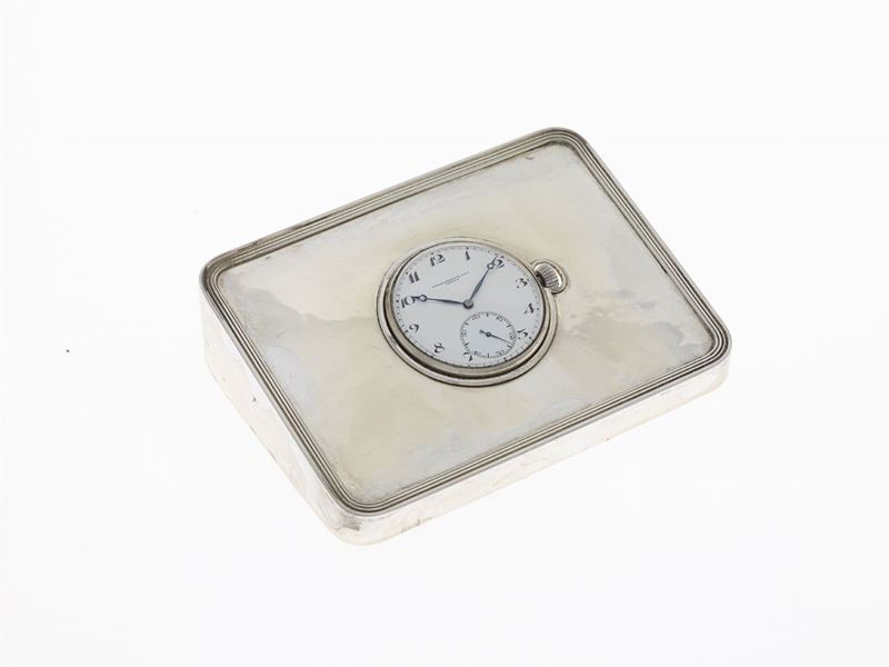 PATEK PHILIPPE PORTAOROLOGIO DA SCRIVANIA IN ARGENTO Sostegno e cassa del movimento in argento. Movimento Patek Philippe meccanico, a carica manuale, n. 163551. Quadrante bianco firmato Patek, Philippe & Cie. Lancette Breguet. Fondello in vetro con movimento a vista. Dimensioni mm. 140 x 95 x 40. Peso lordo g 276. PATEK PHILIPPE. A PATEK PHILIPPE WATCH MOVEMENT MOUNTED IN A SILVER DESKTOP FRAMEStima