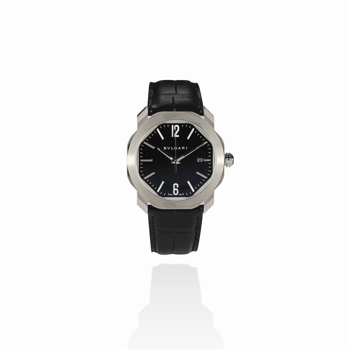 orologio in acciaio, cassa ottagonale, quadrante nero con indici e numeri arabi applicati secondi al centro e data al tre, movimento a carica automatica, con scatola e garanzia.