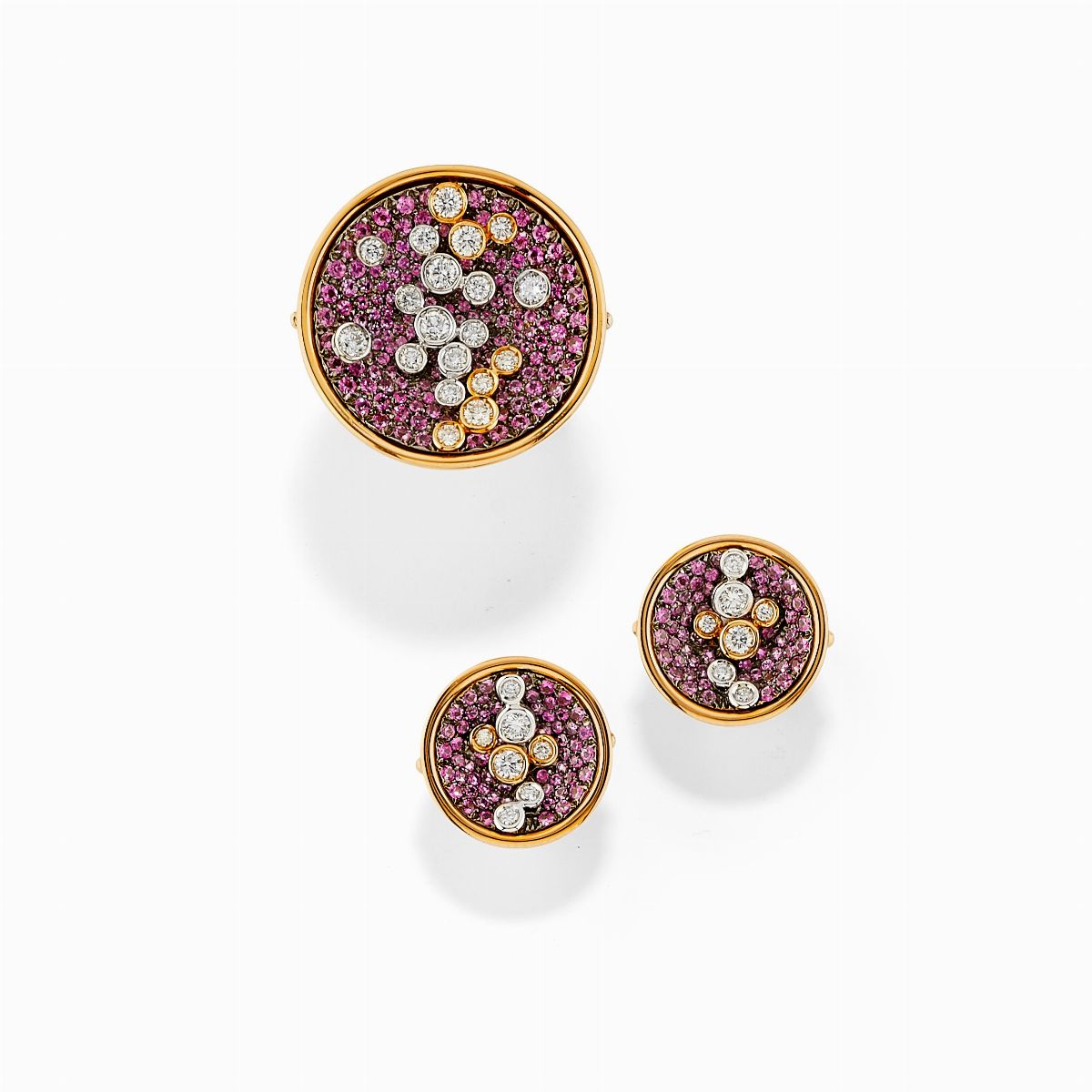 in oro rosa 18K, zaffiri rosa taglio rotondo sfaccettato per totale ct 9,00 ca e diamanti taglio brillante per totale ct 2,60 circa, composta da anello, orecchini e collana.
