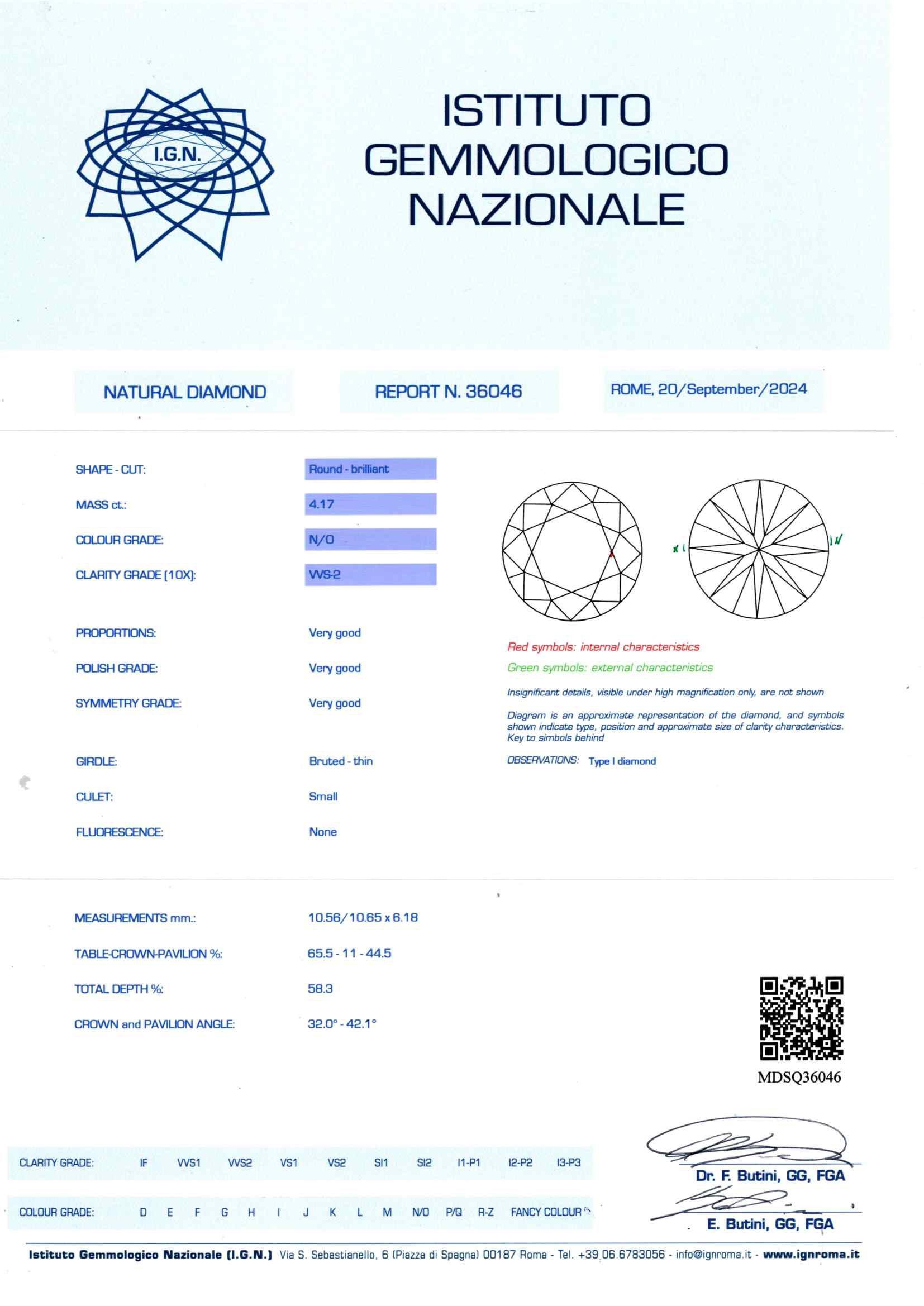 Il diamante è accompagnato da certificato gemmologico n. 36046 del 20/09/2024, IGN Roma.