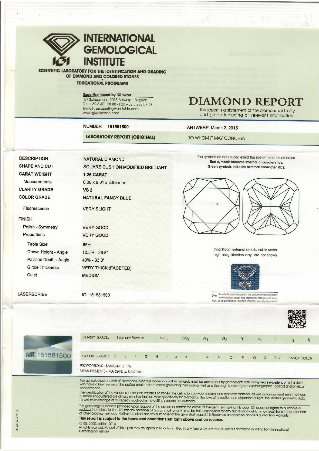 Il diamante fancy blue è accompagnato da certificato gemmologico n. 151581500 del 2/03/2015, IGI Antwerp.