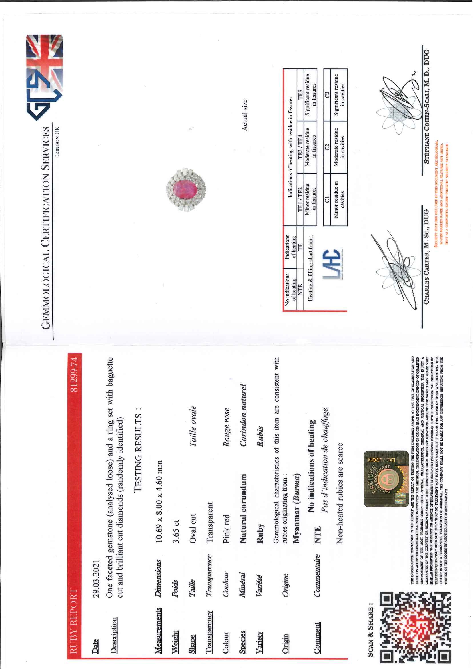 Il rubino, che non presenta indicazioni di trattamento termico, è accompagnato da certificato gemmologico n. 81299-74 del 29/03/2021, GCS Londra.