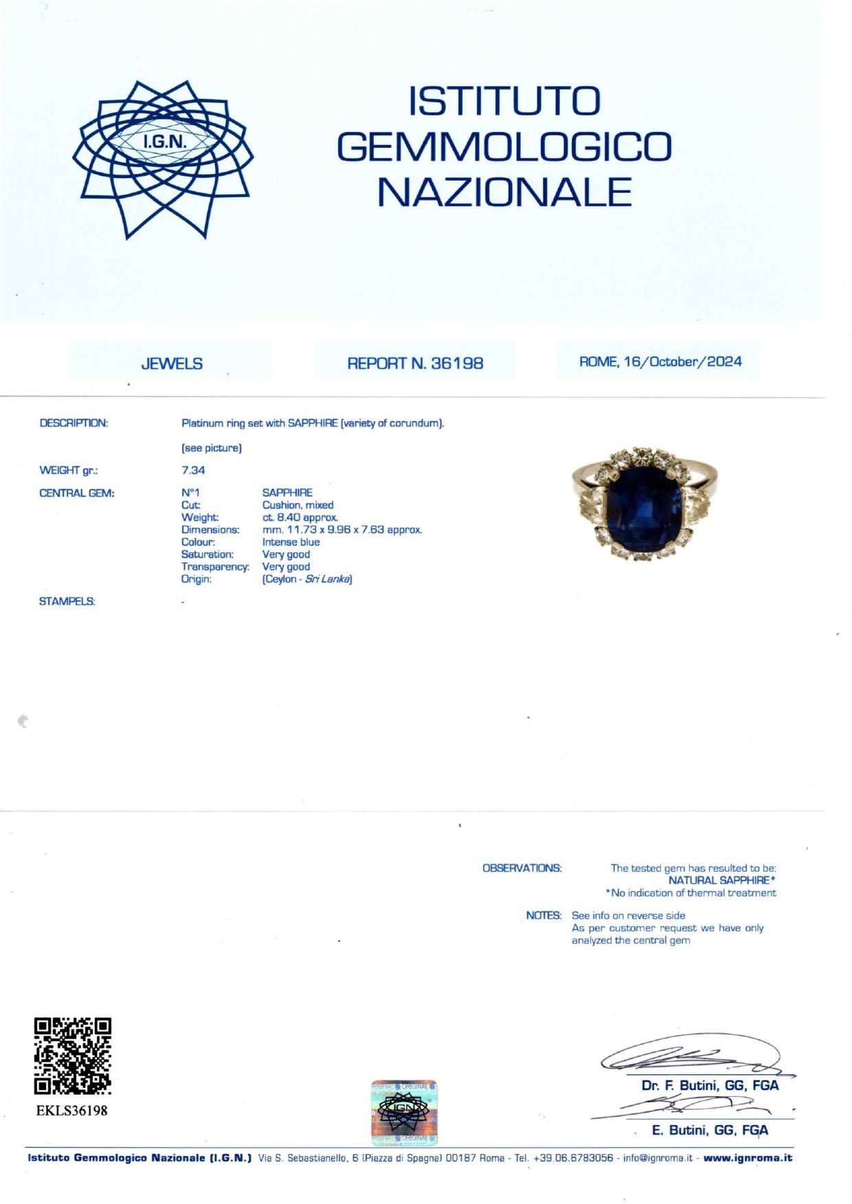 in platinoal centro zaffiro Ceylon taglio cuscino di ct 8,40 circa contorno in diamanti taglio brillante e scudo per totale ct 1,20 circa.