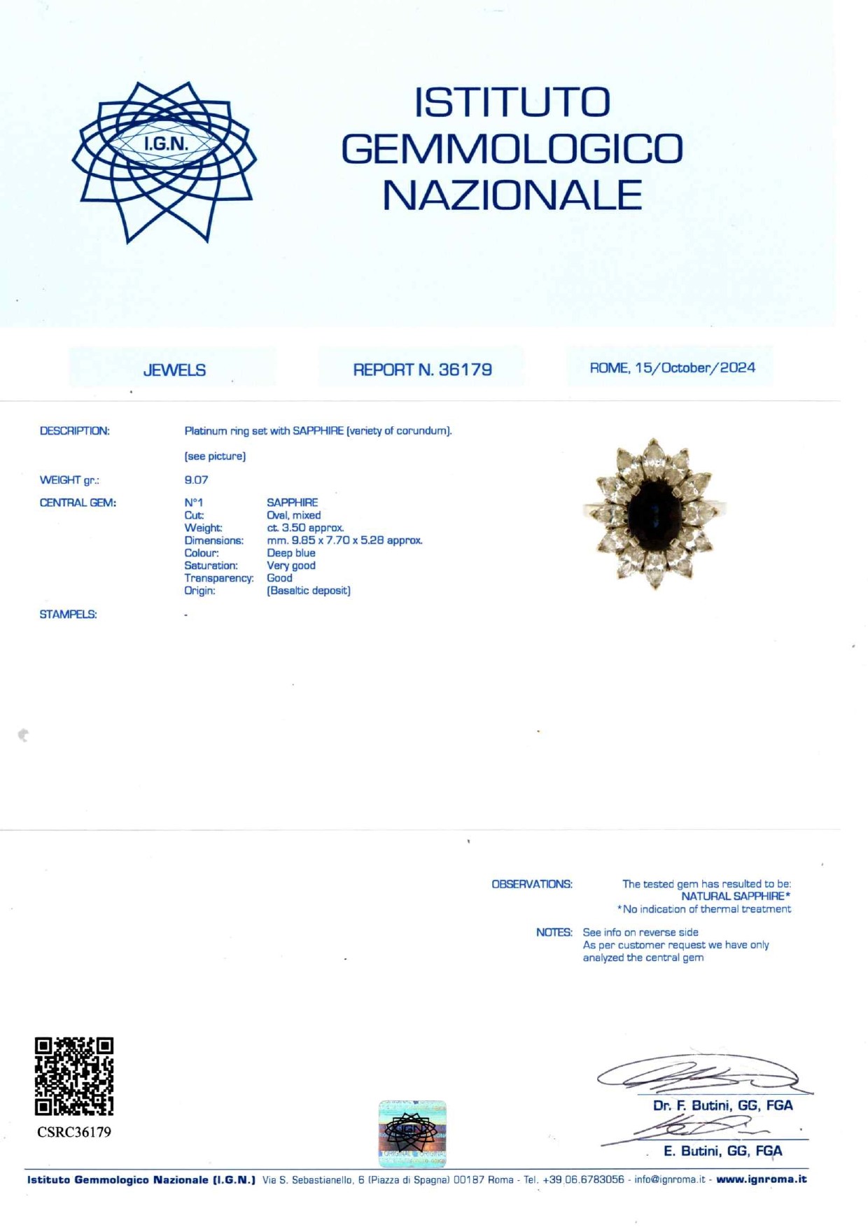 in platinoal centro zaffiro taglio ovale di ct 3,50 circa, contorno in diamanti taglio navette per totale ct 3,00 circa.