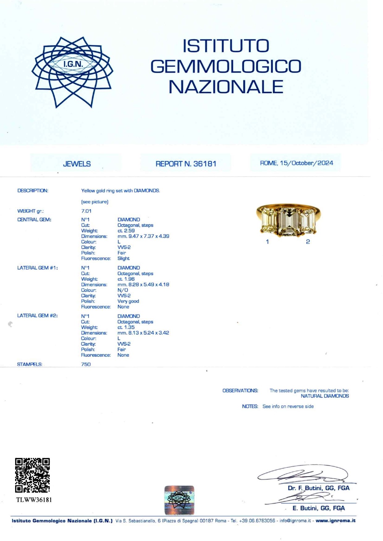 L'anello è accompagnato da certificato gemmologico n. 36181 del 15/10/2024, IGN Roma.