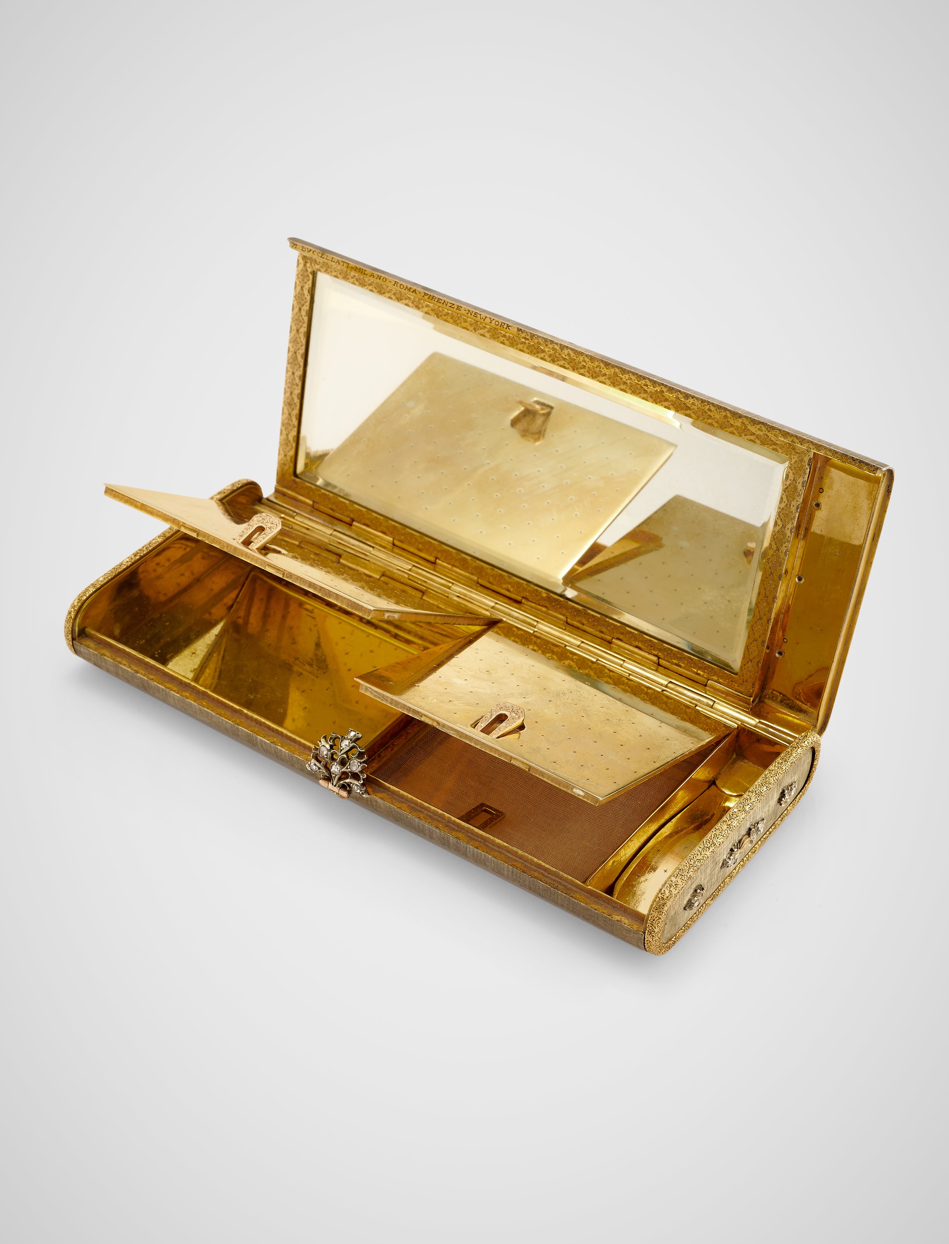 di forma rettangolare in oro giallo, esterno rivestito da un sottile strato in argento satinato, decorata da motivi floreali in diamanti, all'interno due scomparti con coperchio porta sigarette e porta cipria con retina amovibile, porta rossetto, specchio e ferma soldi incisi e satinati, firmata M. Buccellati-Milano-Roma-Firenze-New York, con astuccio.