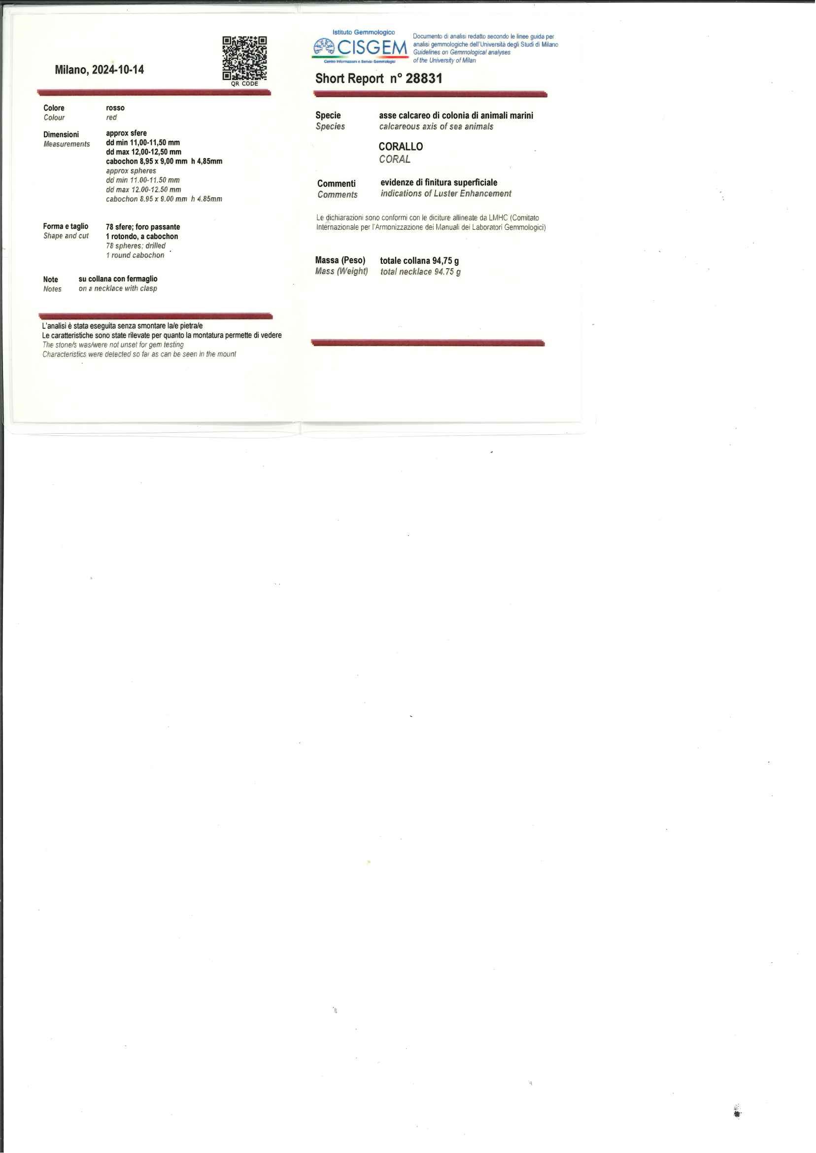in oro giallo 18kad un filo di boules di corallo rosso da mm 11,00-11,50/12,00-12,50.
