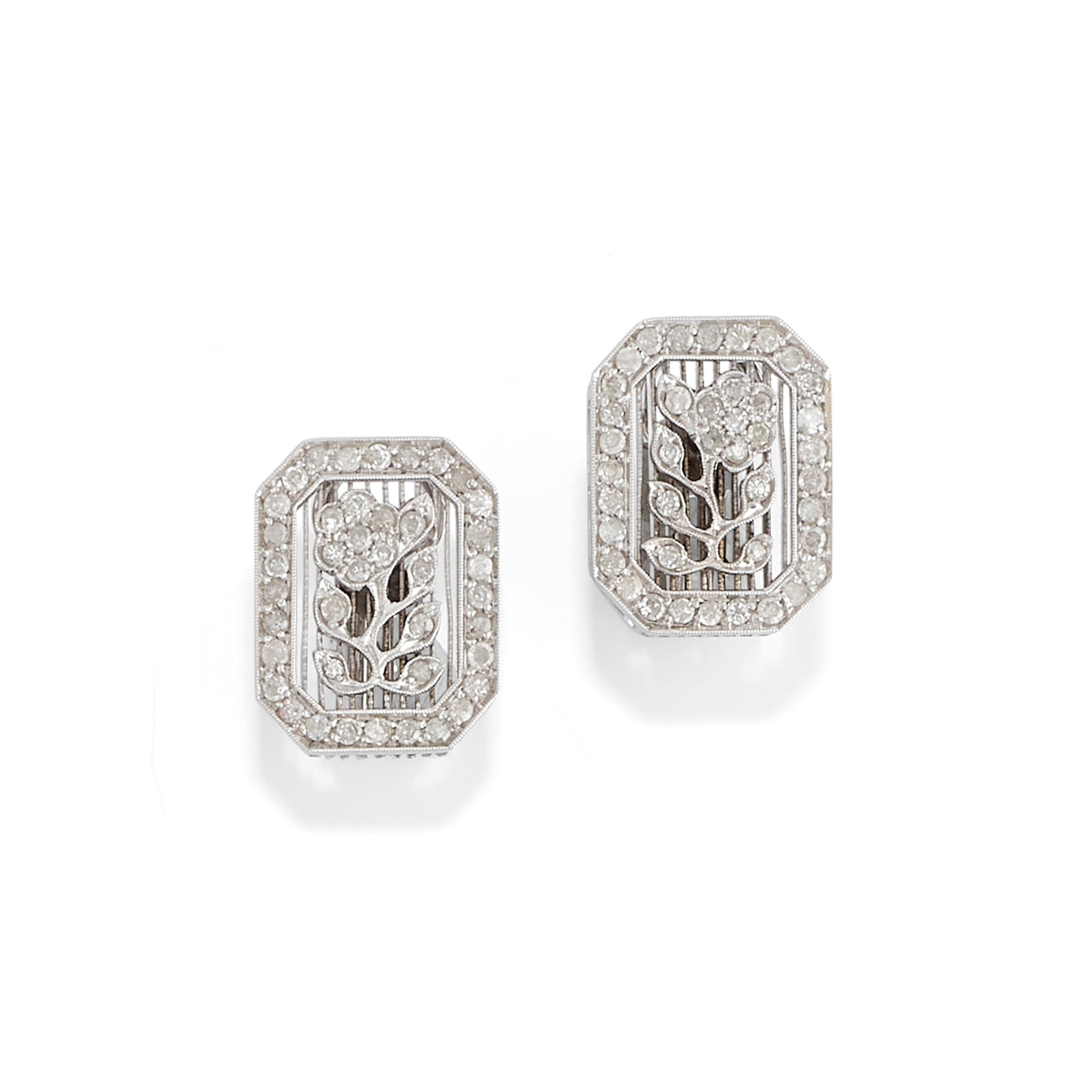 di forma ottagonale con motivo floreale in diamanti taglio huit-huit per totale ct 2,20 circa, composta da anello e coppia di orecchini con chiusura a clip.