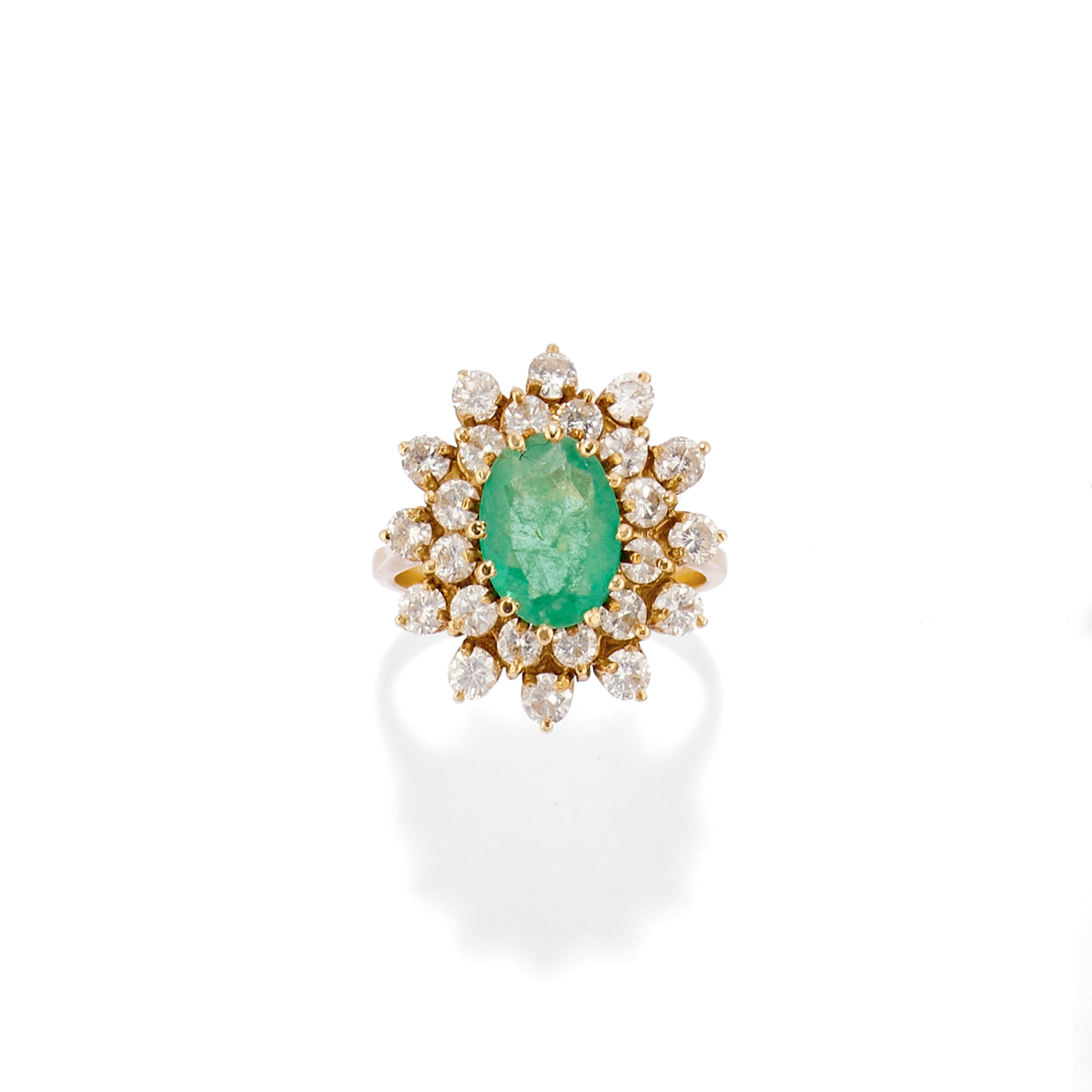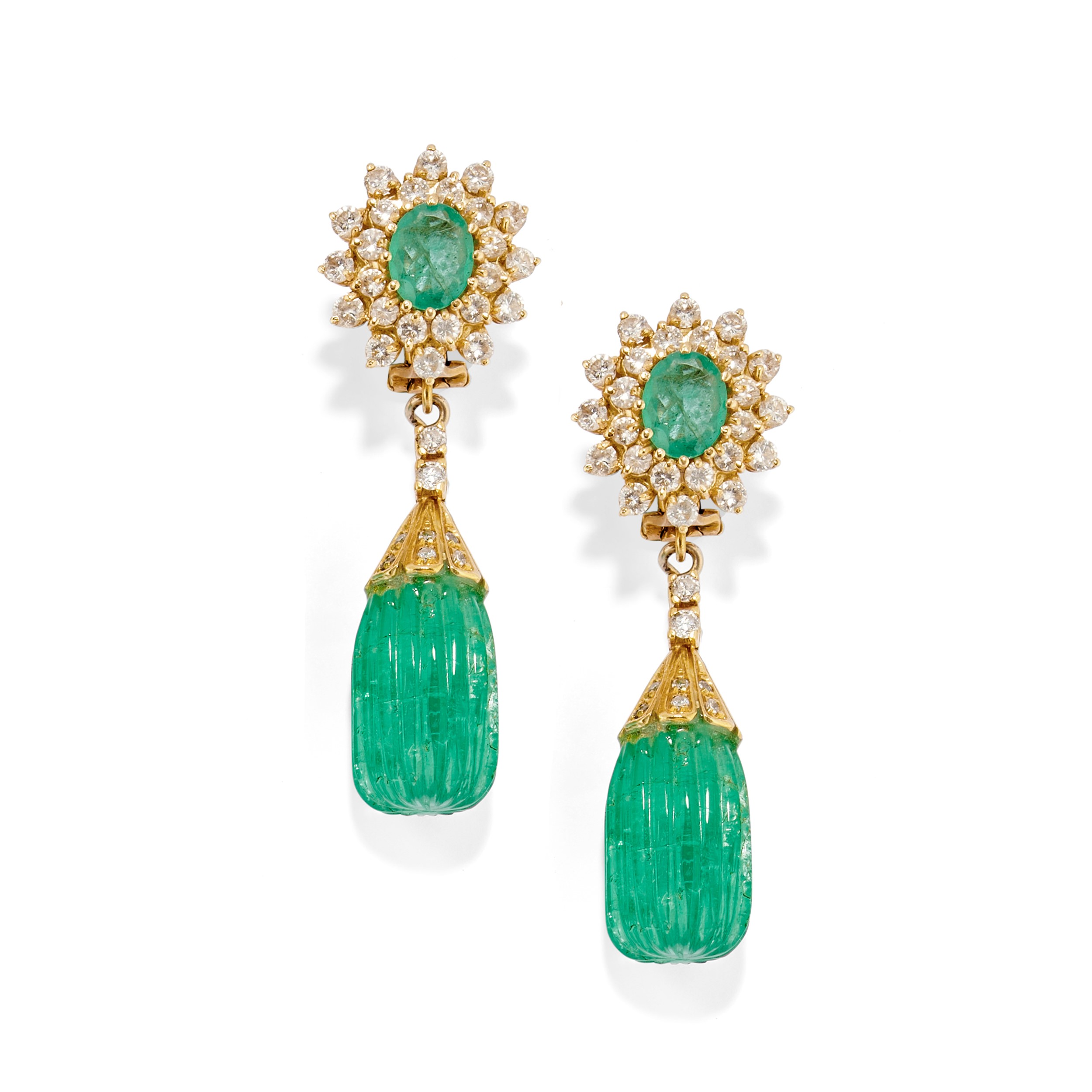in oro giallo 18kcomposta da anello a fiore con al centro smeraldo taglio ovale e doppio contorno in diamanti taglio brillante e da orecchini con lo stesso motivo trattenenti pendenti estraibili in smeraldi incisi di mm 20,00x13,00 circa;