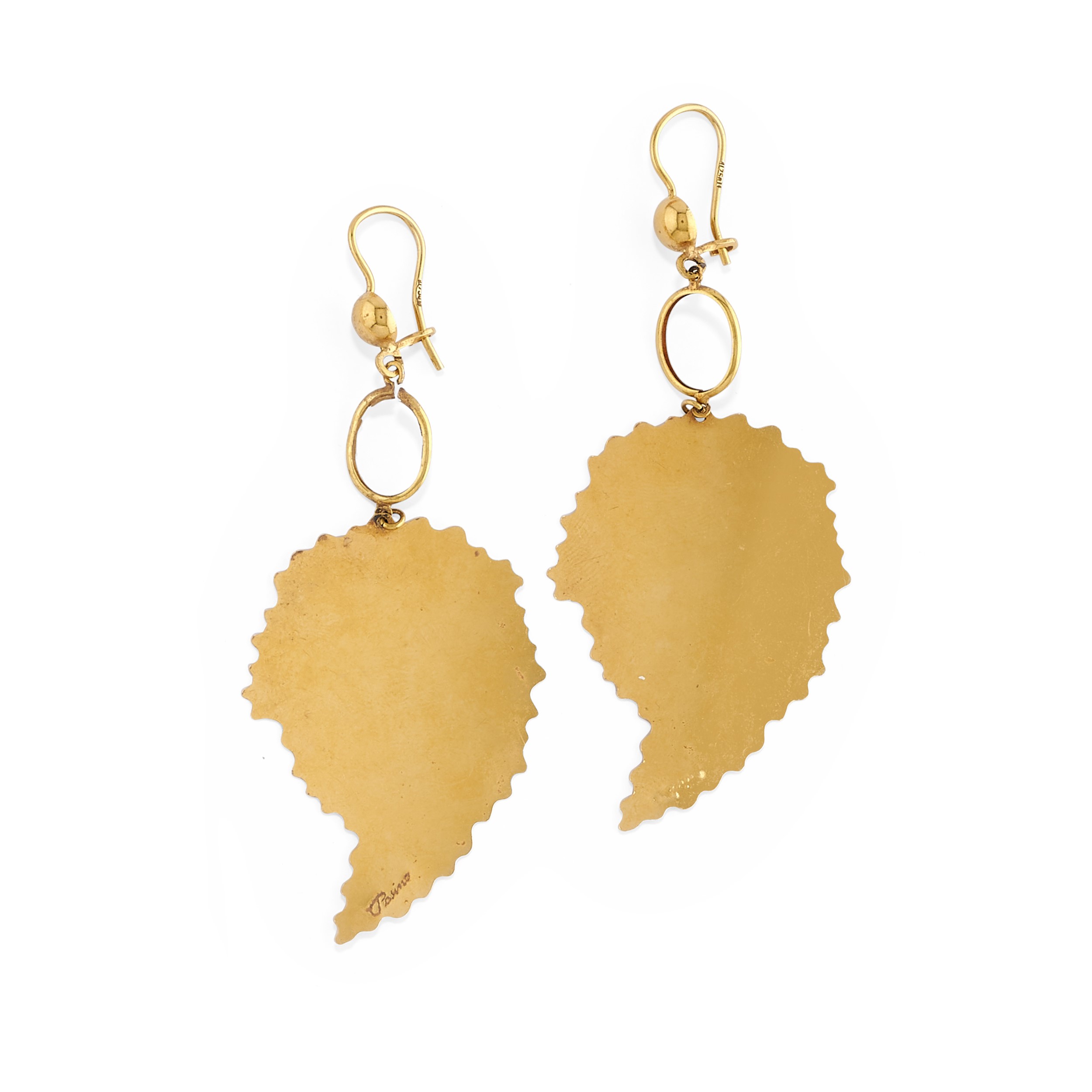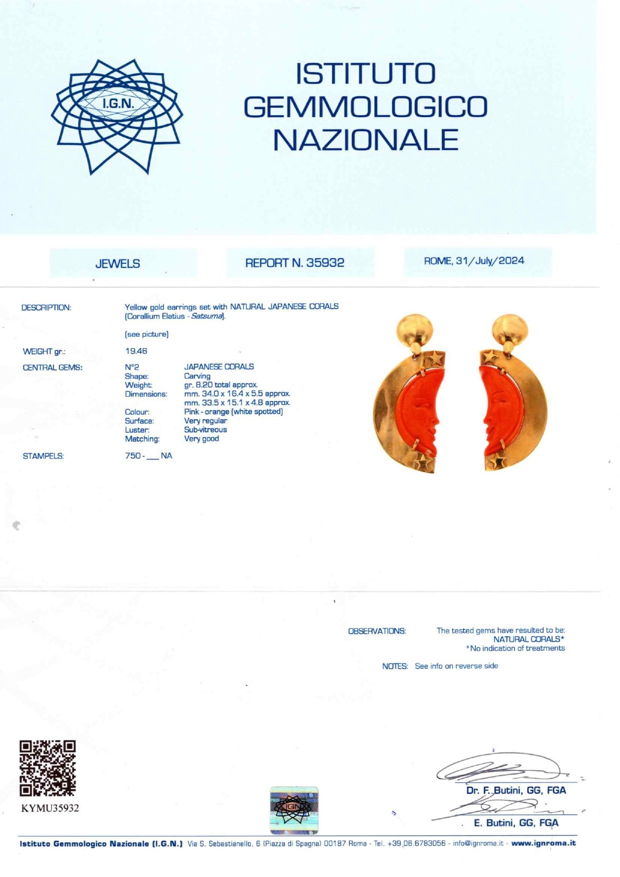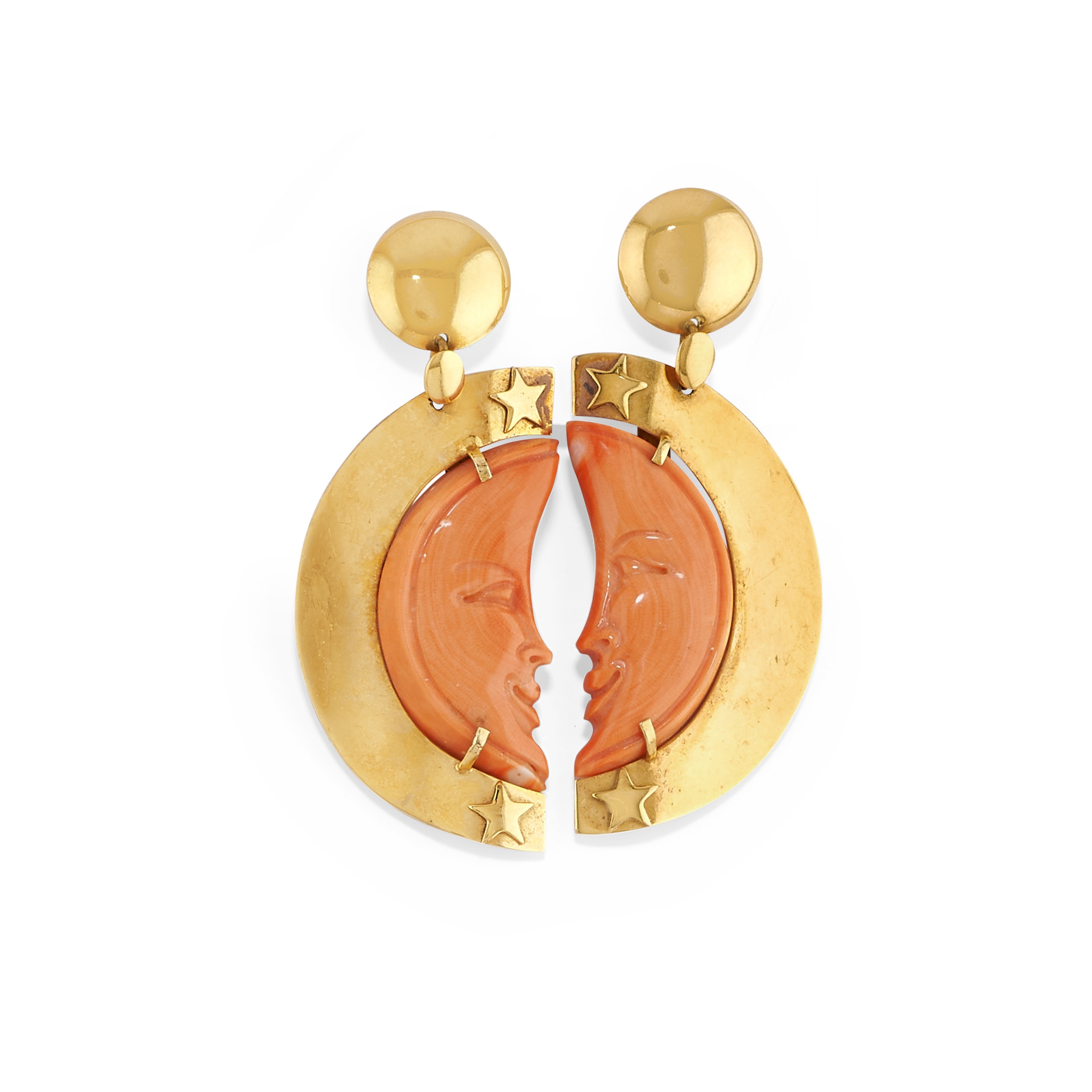 in oro giallo 18kuna a forma di mezza luna con corallo giapponese inciso, chiusura perno e farfalla, l'altra a forma di foglia con chiusura a monachella, difetti (una farfallina mancante).