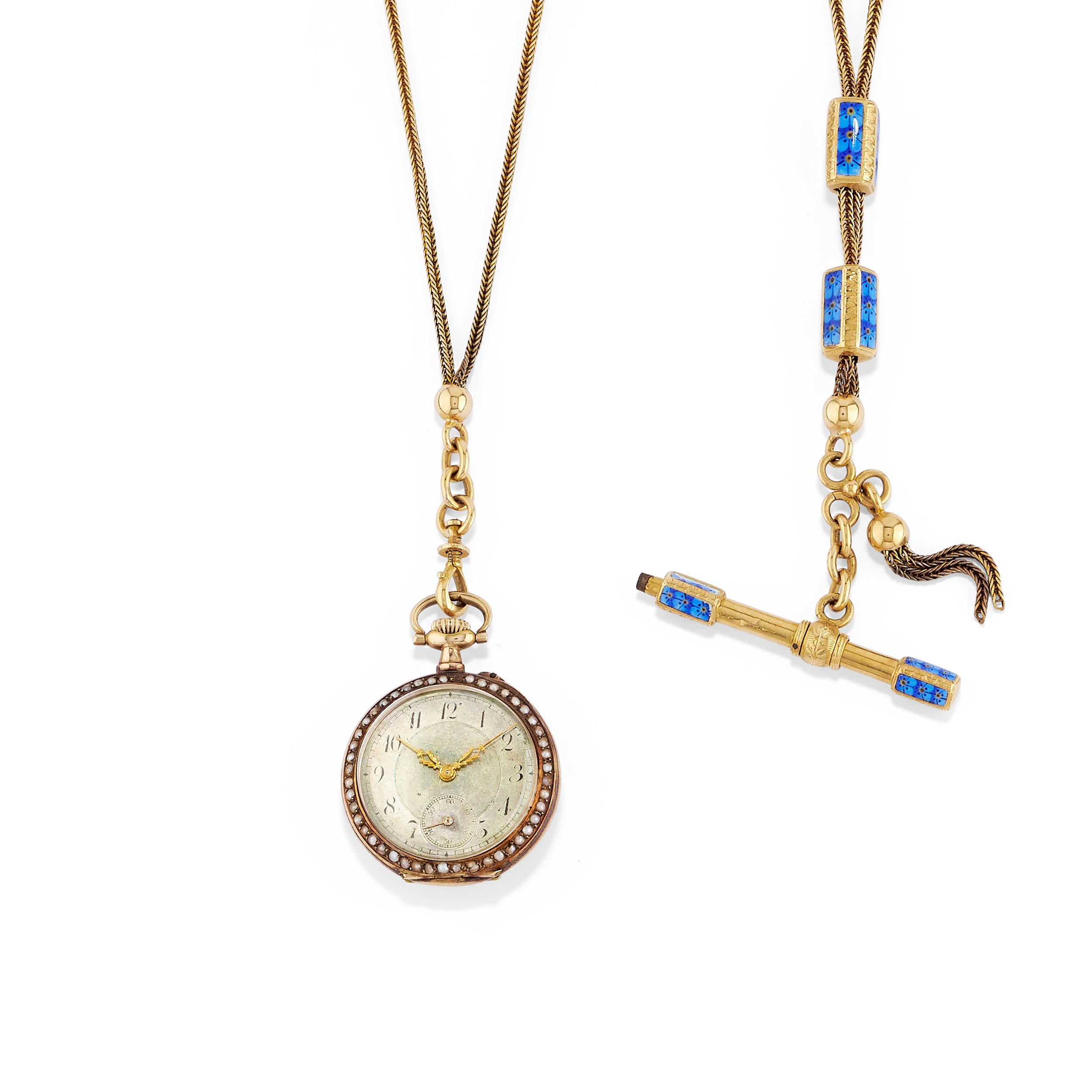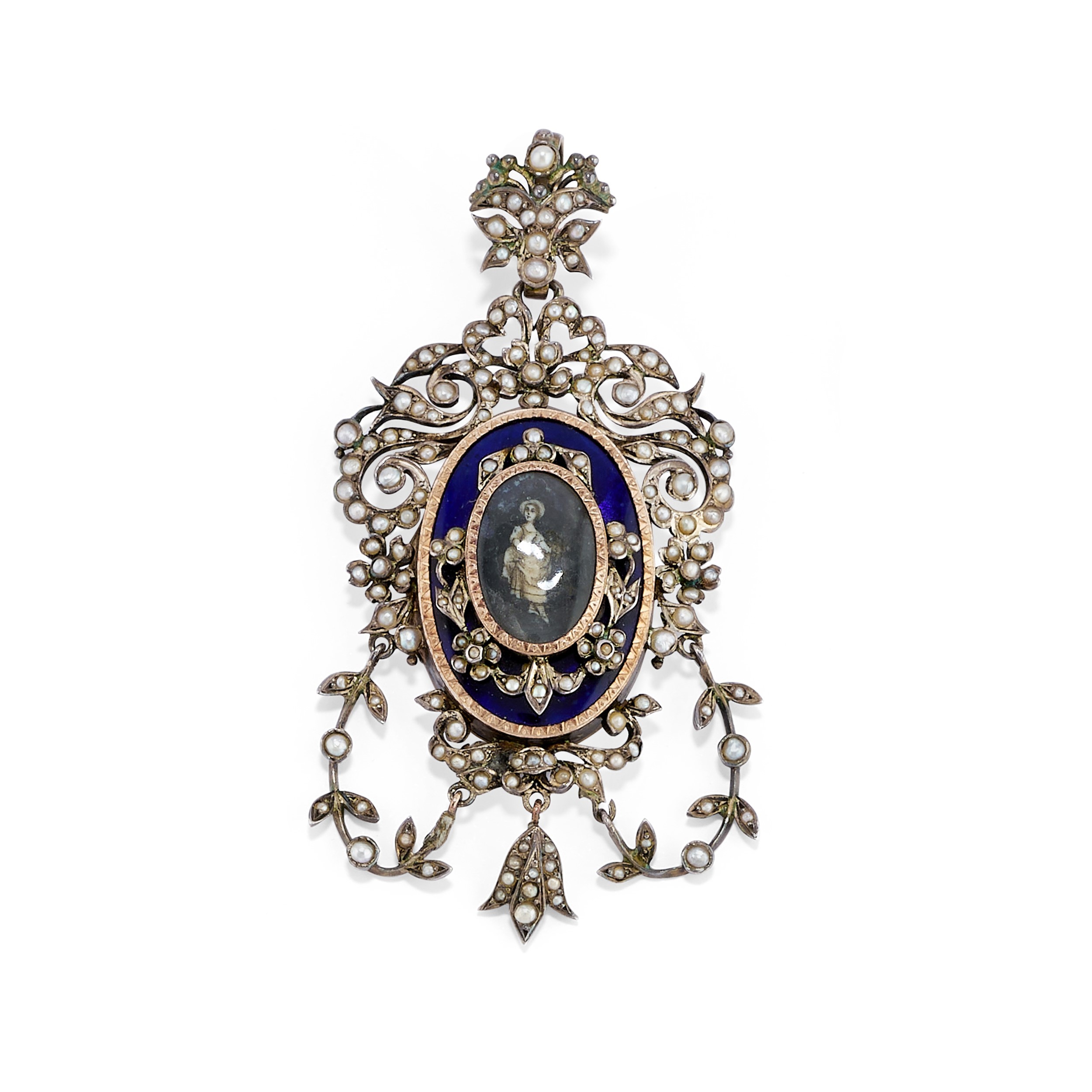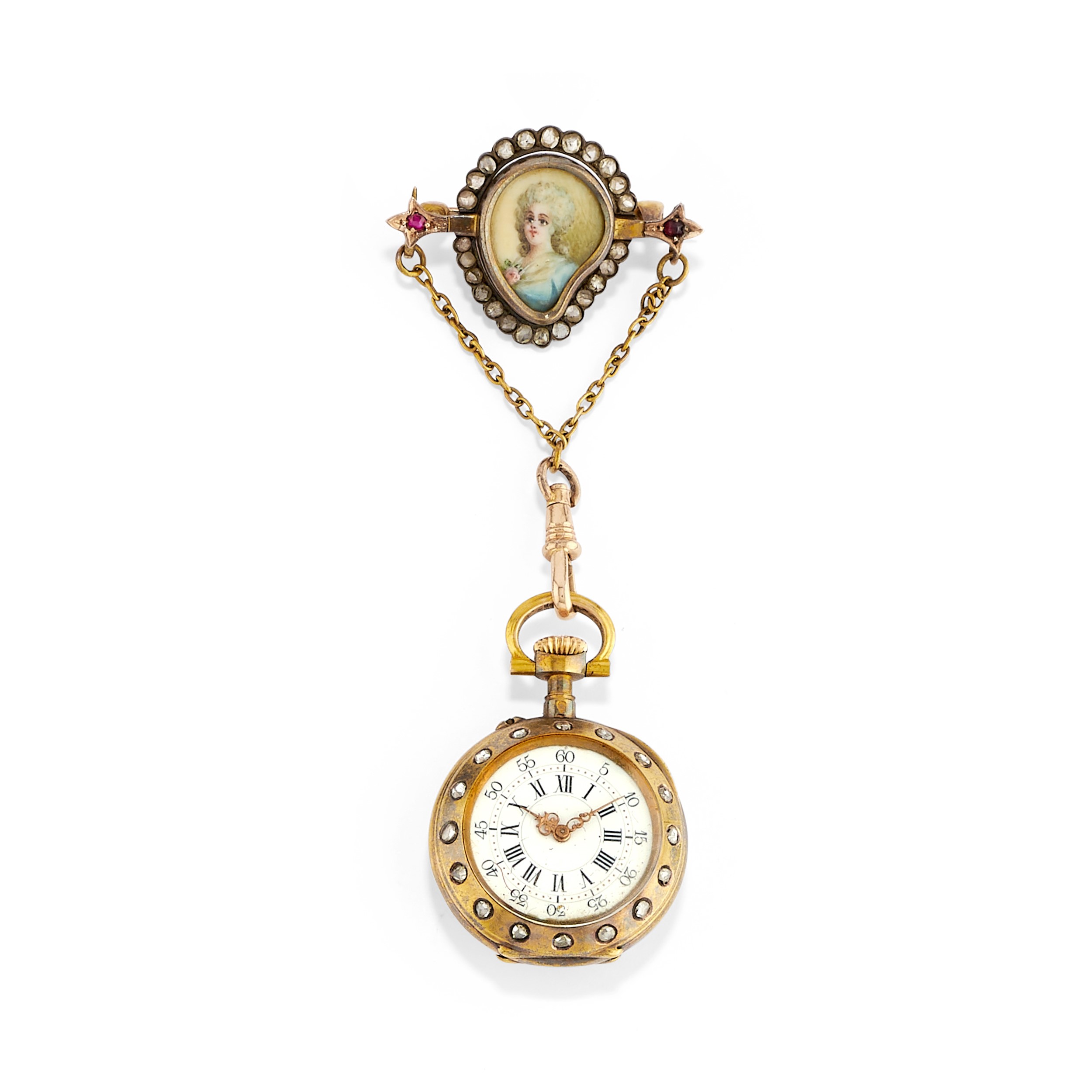 in oro giallo 18k, bassa caratura e argentocomposto da orologio da tasca in smalto, microperle e diamante taglio vecchio, monachina con ritratto di nobildonna entro giro di diamanti taglio rosa e pendente portafoto in smalto e microperle con ritratto femminile, orologi da revisionare.