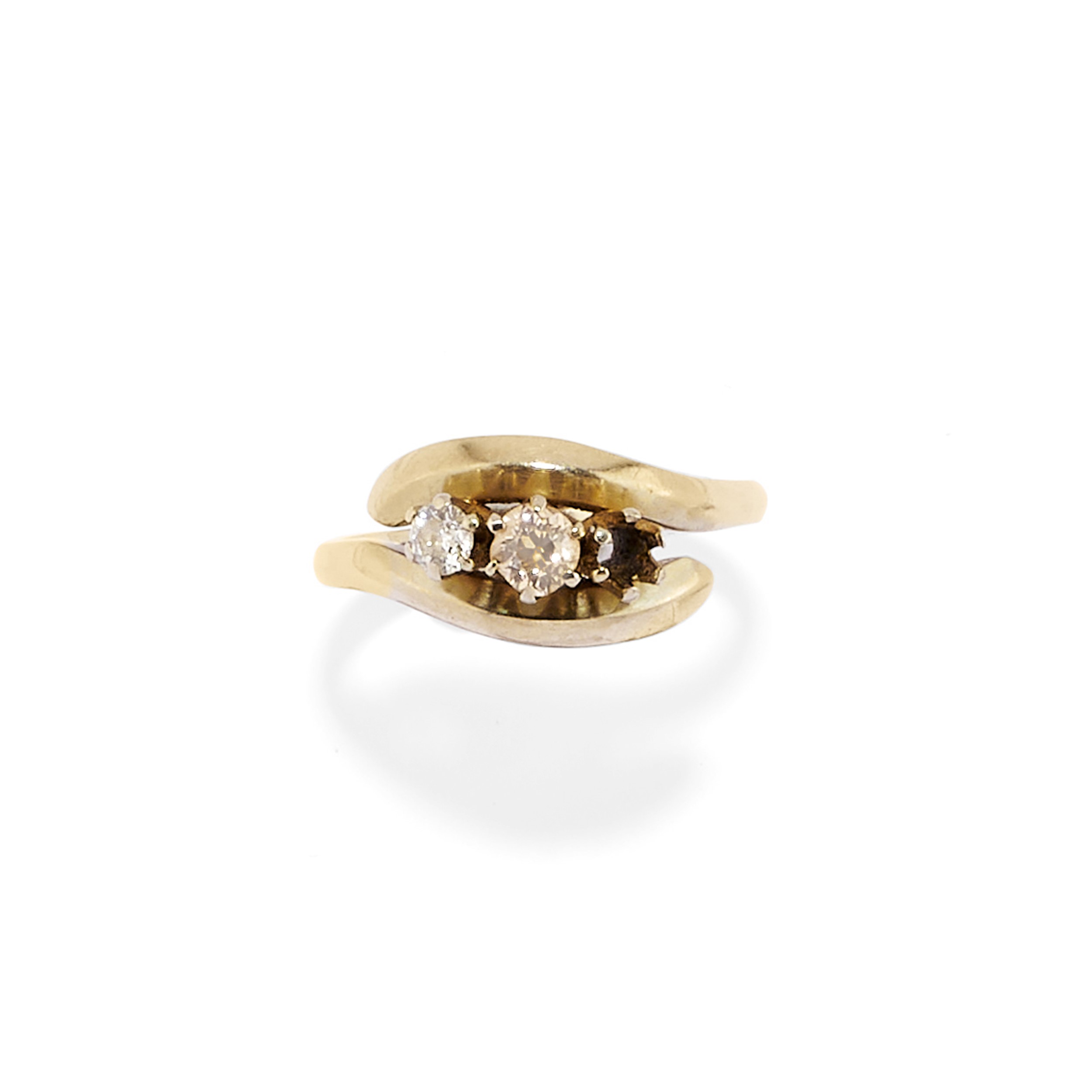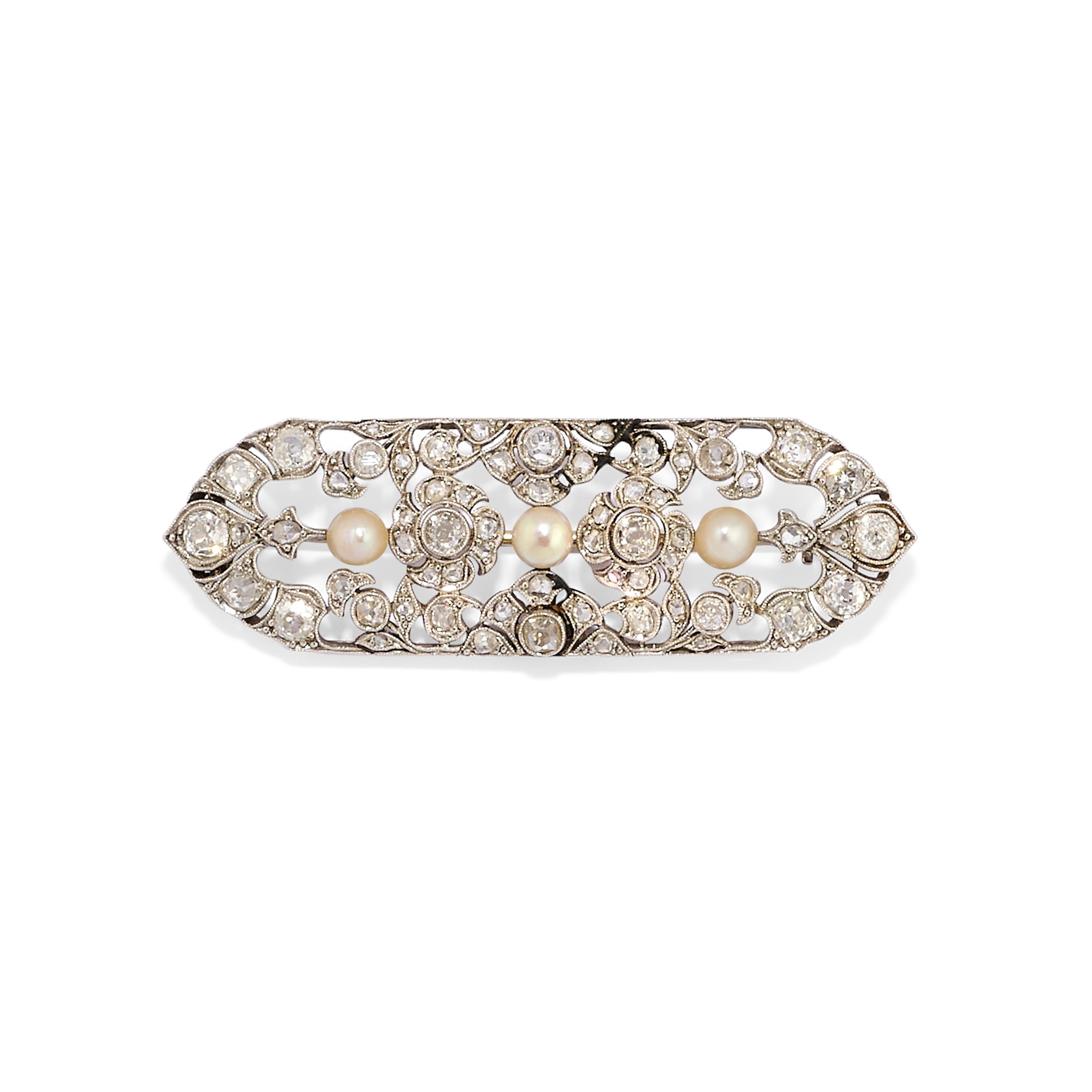 in platino e oro bianco 18kcomposto da spilla a saponetta traforata con diamanti taglio vecchio e rosa per totale ct 1,80 circa e perline, anello con diamanti taglio vecchio per totale ct 0,40 circa, difetti (un diamante dell'anello mancante).