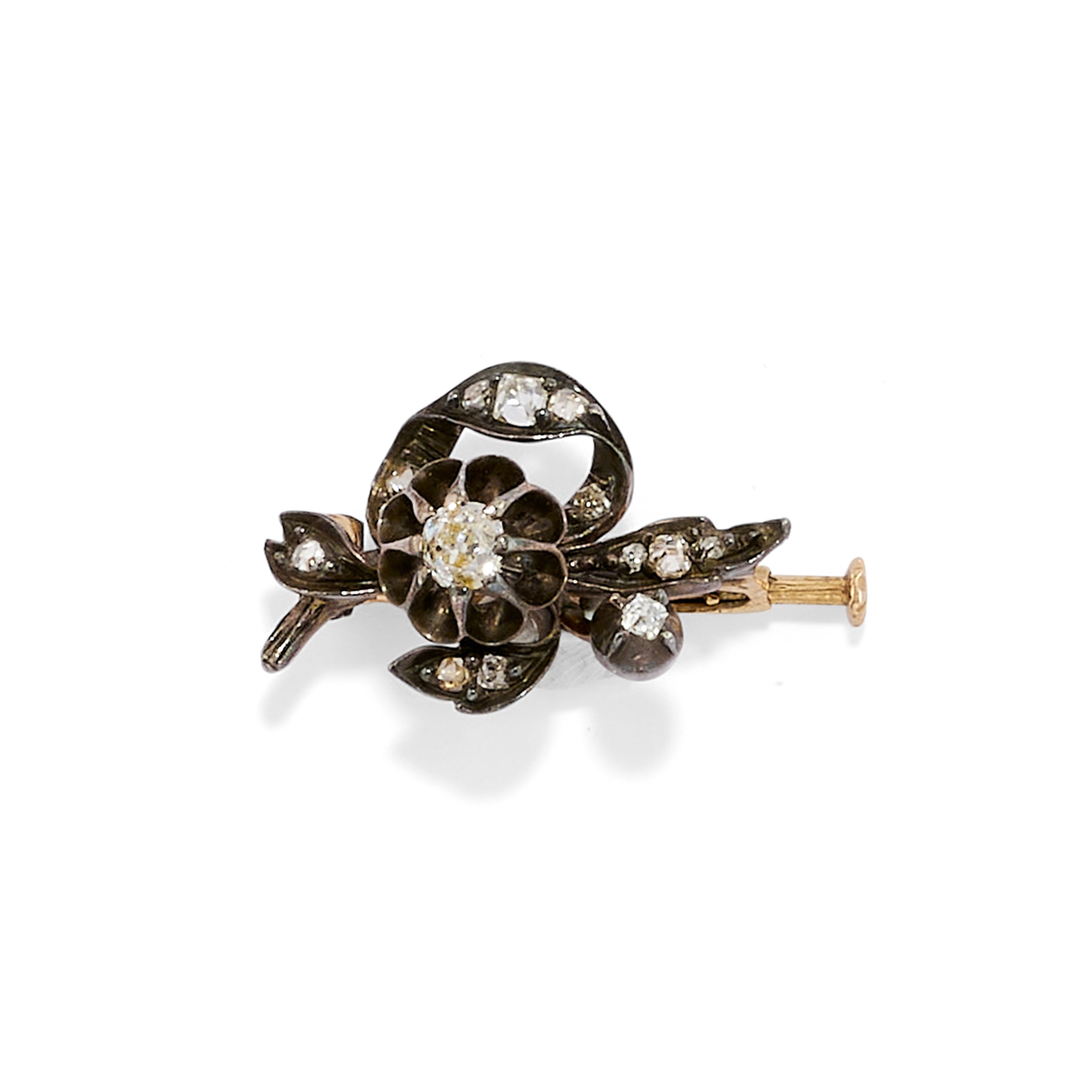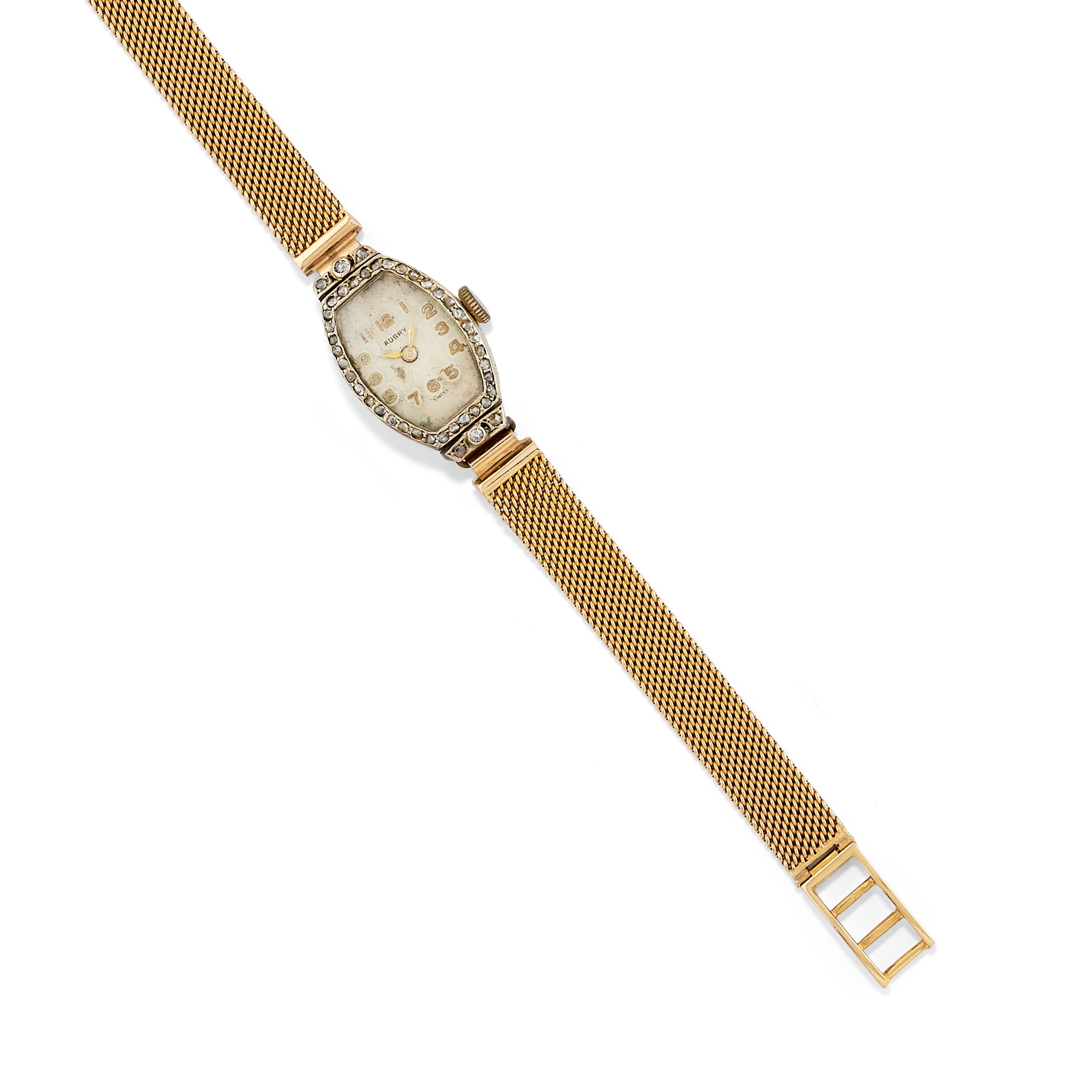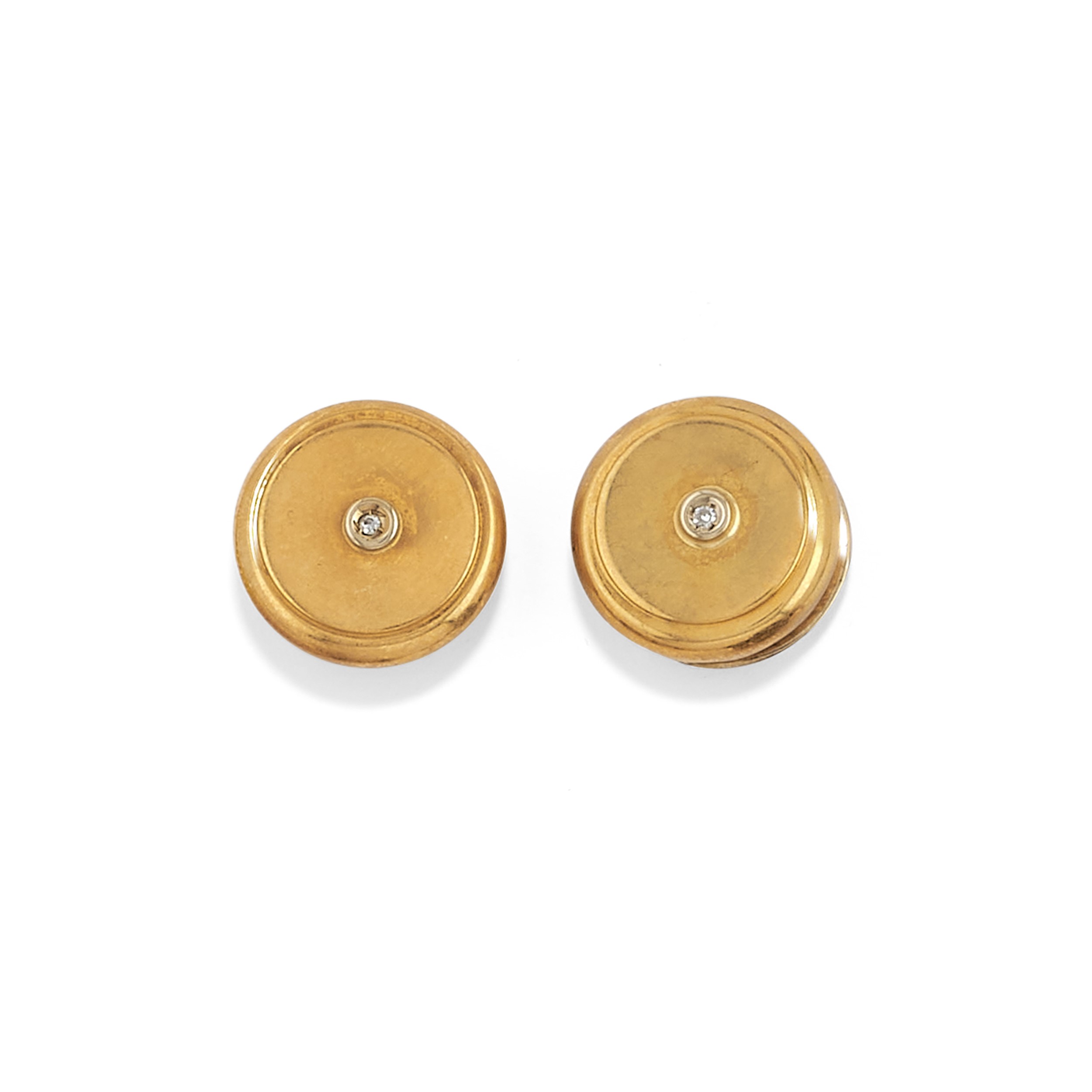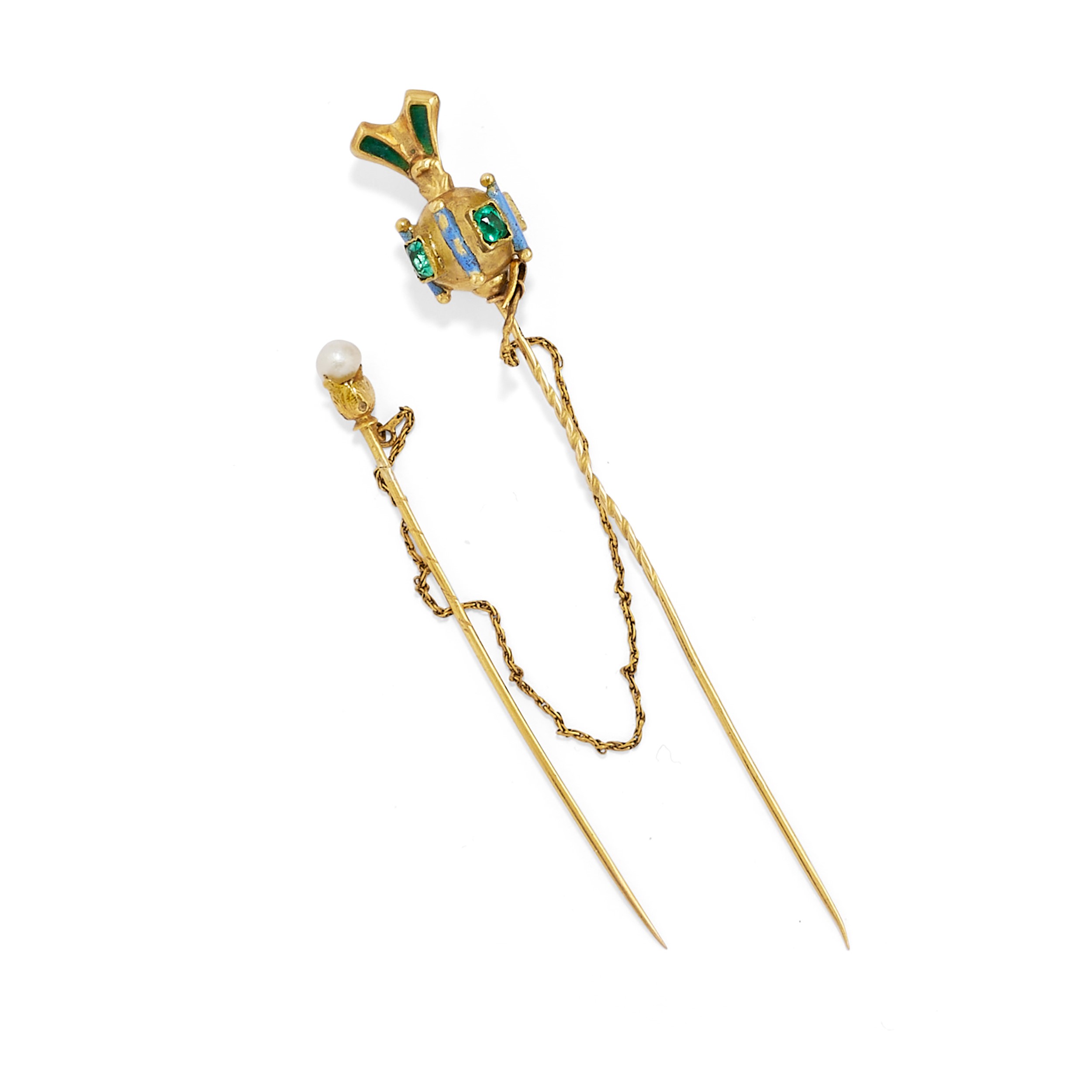 in oro giallo 18k, argento e platinocomposto da coppia di copri bottoni, coppia di spilloni, un pendente frangiato, una spilla e un orologio da revisioanre, decorati da diamanti, smalto, microperle e pietre di colore.