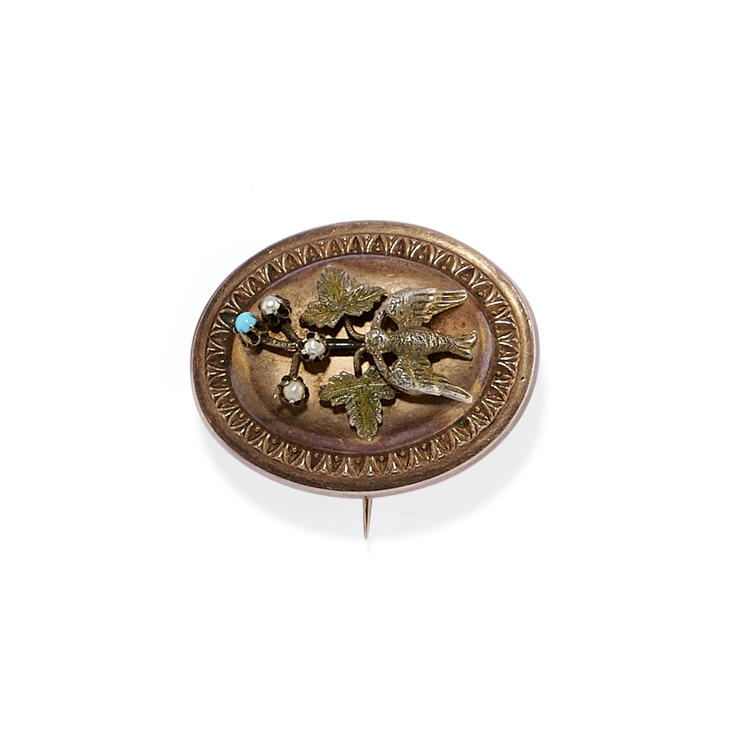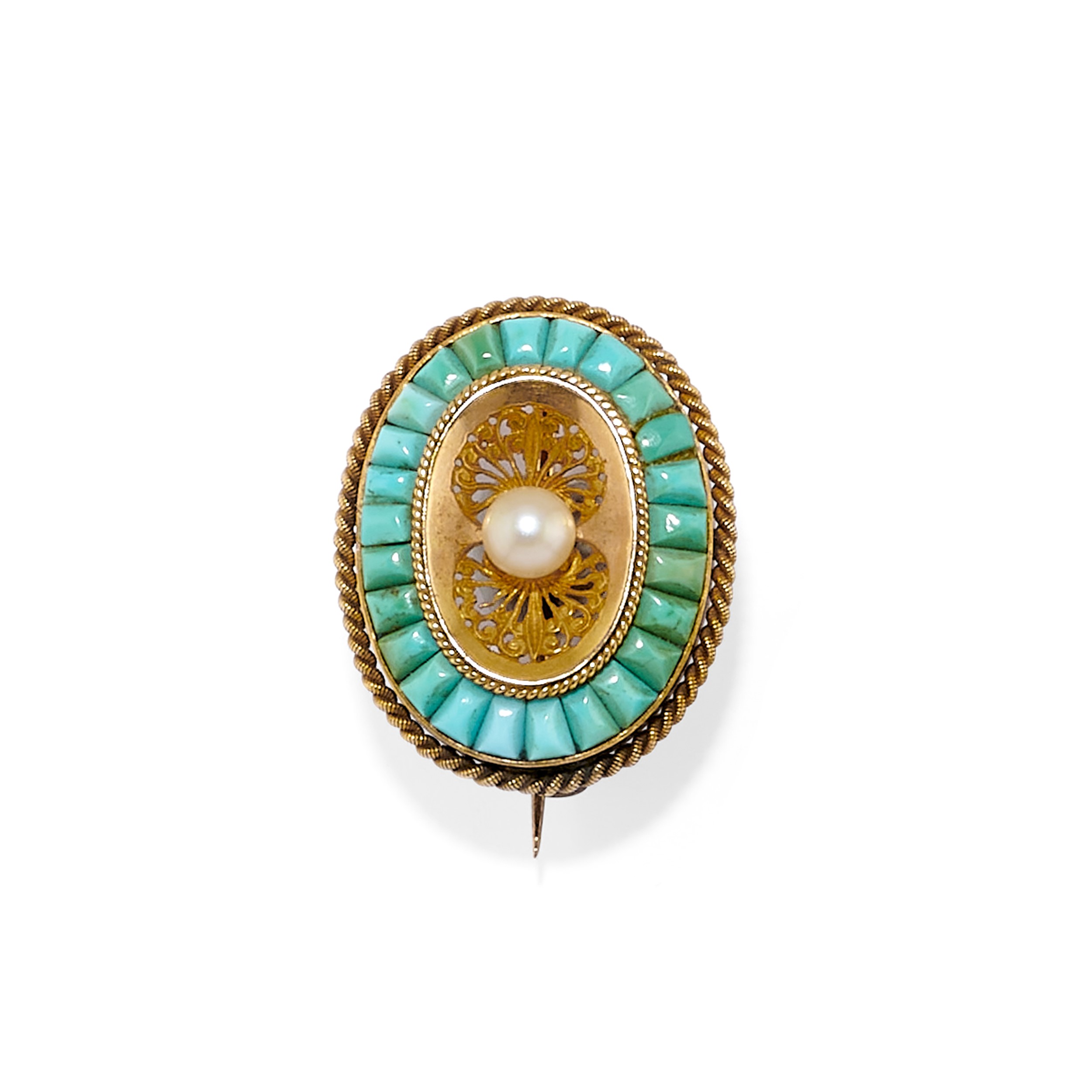 in oro bassa caratura e metallodue di forma ovale con turchesi e perle, una con smalto, difetti (mancanza di smalto).