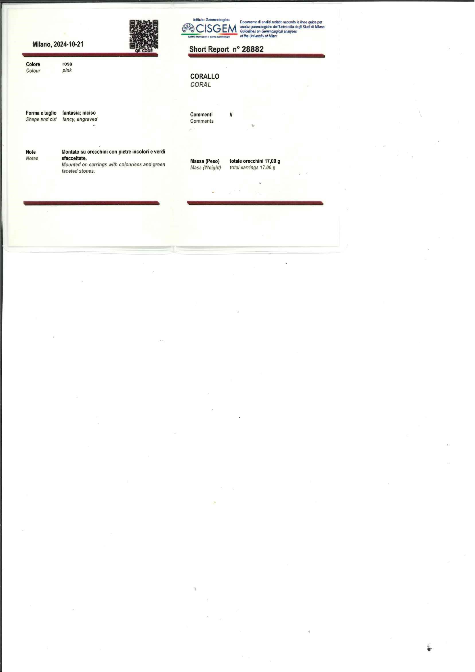 in oro giallo 18kforma a navette, con corallo rosa costolato, sormontato da crisoprasio taglio goccia cabochon e motivo in diamanti taglio brillante per totale ct 0,20 circa, chiusura a clip.