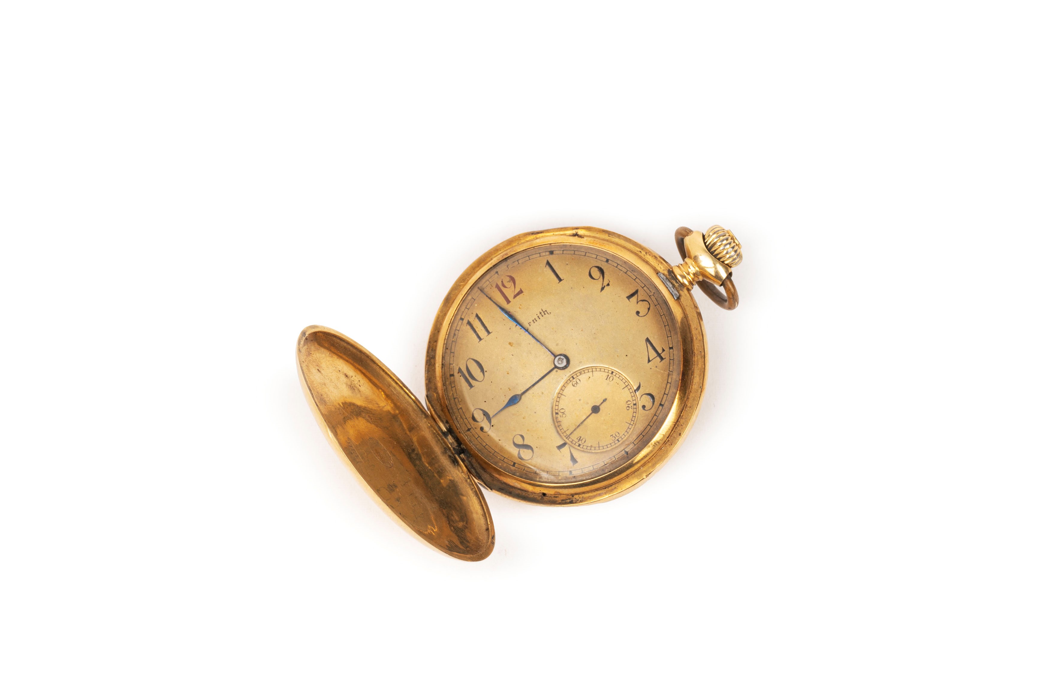 in oro giallo 18kcassa rotonda, quadrante champagne con numeri arabi in smalto nero e rosso, secondi al 6, movimento a carica manuale, difetti (ammaccature).
