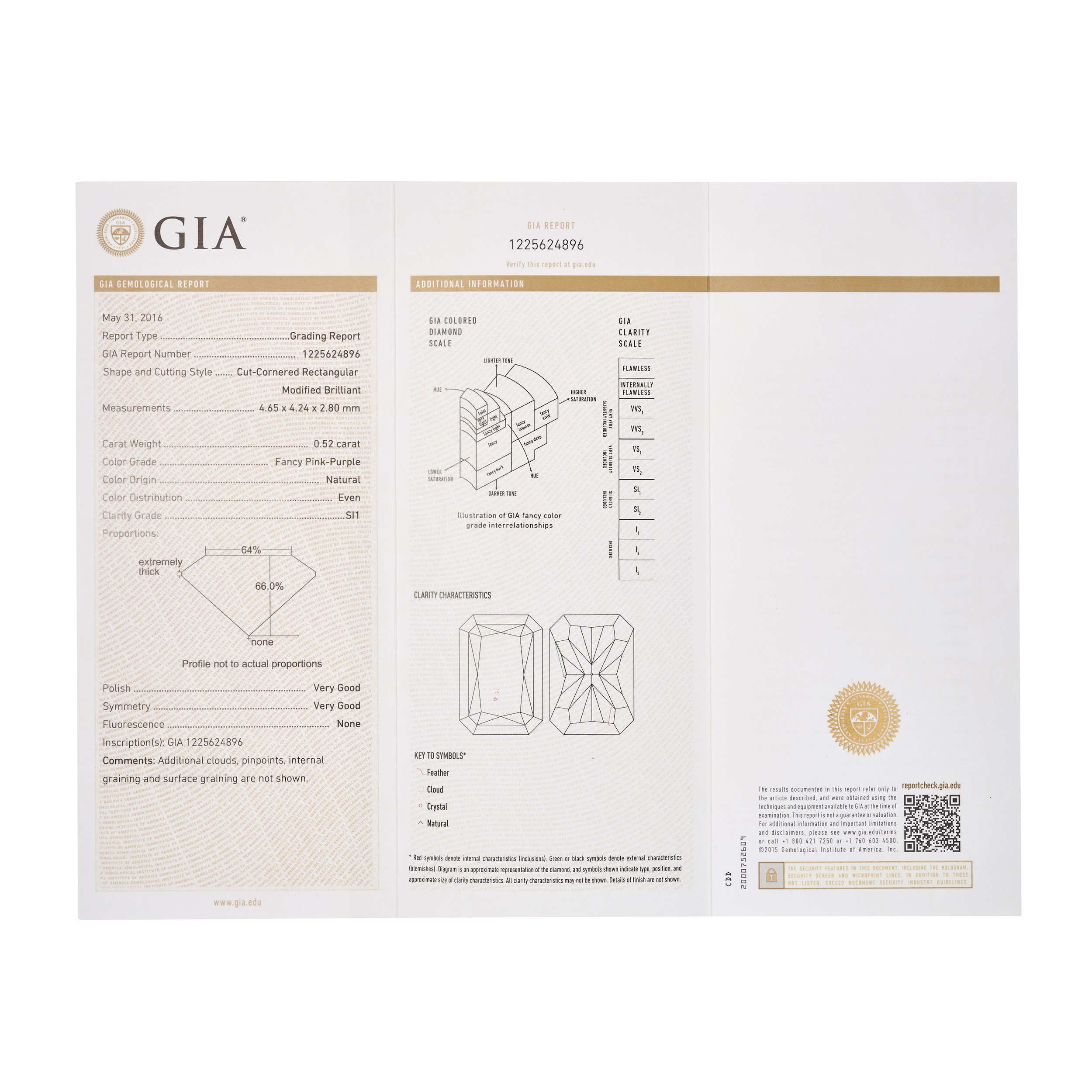 in oro bianco 18kal centro diamante fancy colore pink-purple taglio rettangolare di ct 0,52 (caratura incisa), entro contorno di diamanti taglio brillante, con scatola.