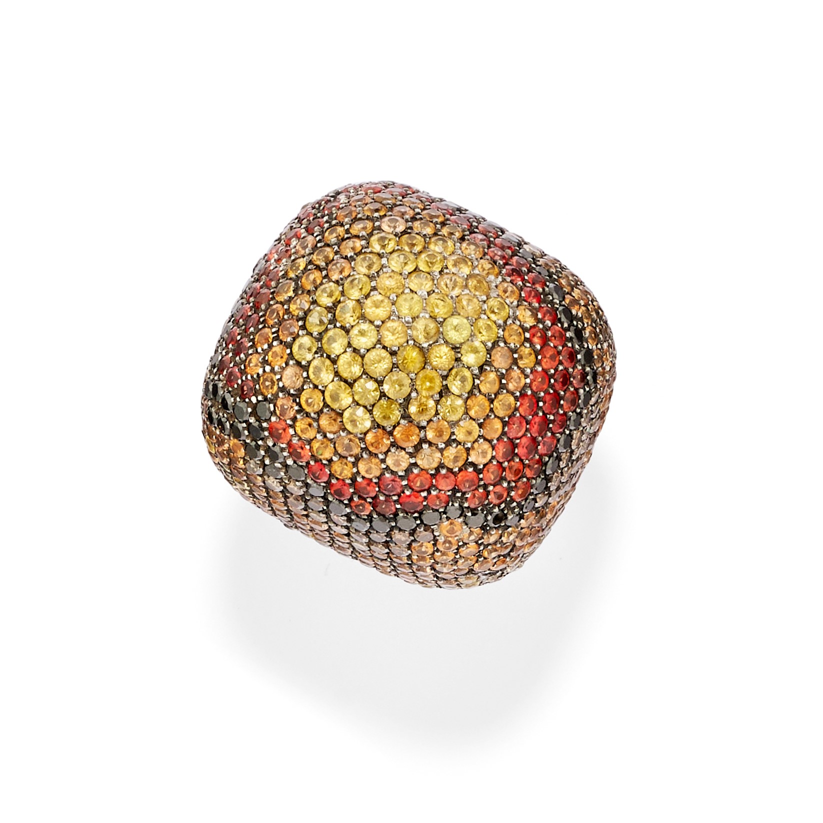 in oro bianco 18kbombato, interamente decorato da motivi in pietre di colore (prob. zaffiri) e diamanti neri e brown taglio rotondo.