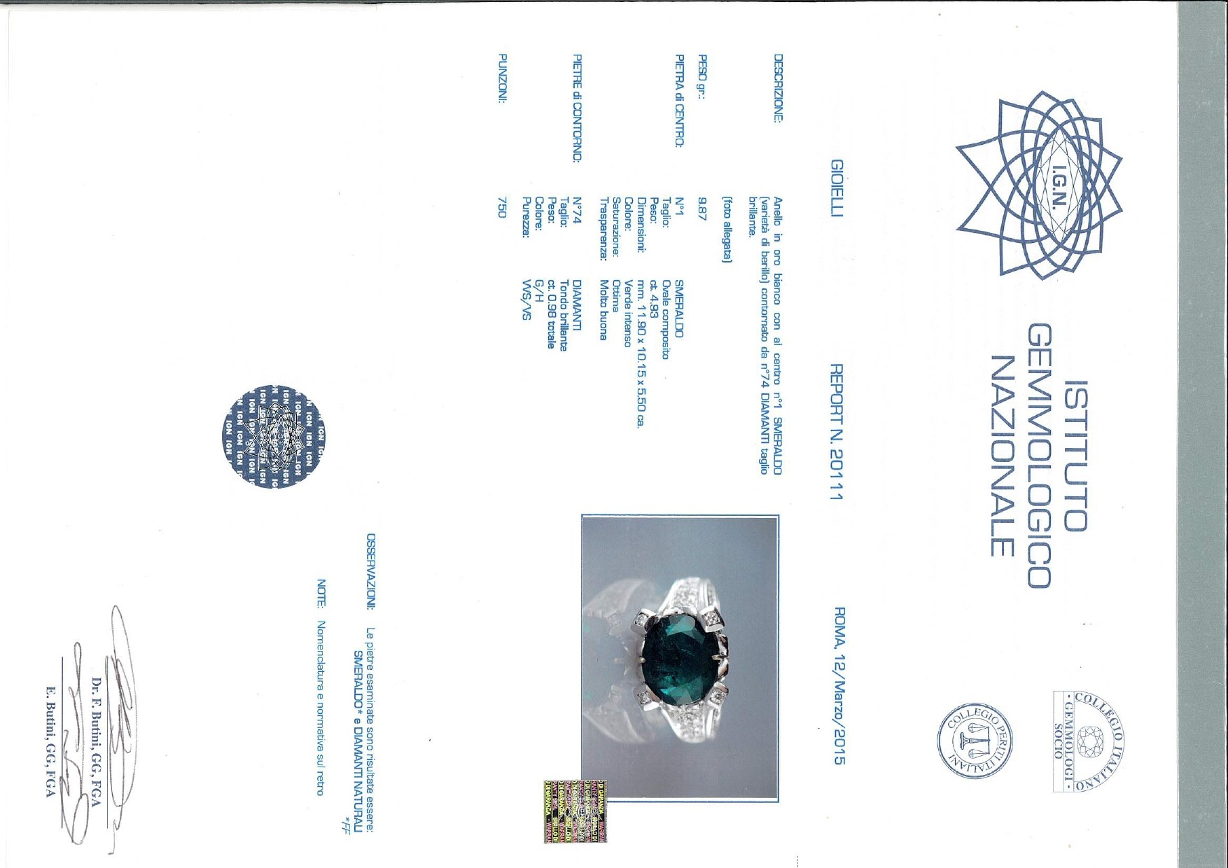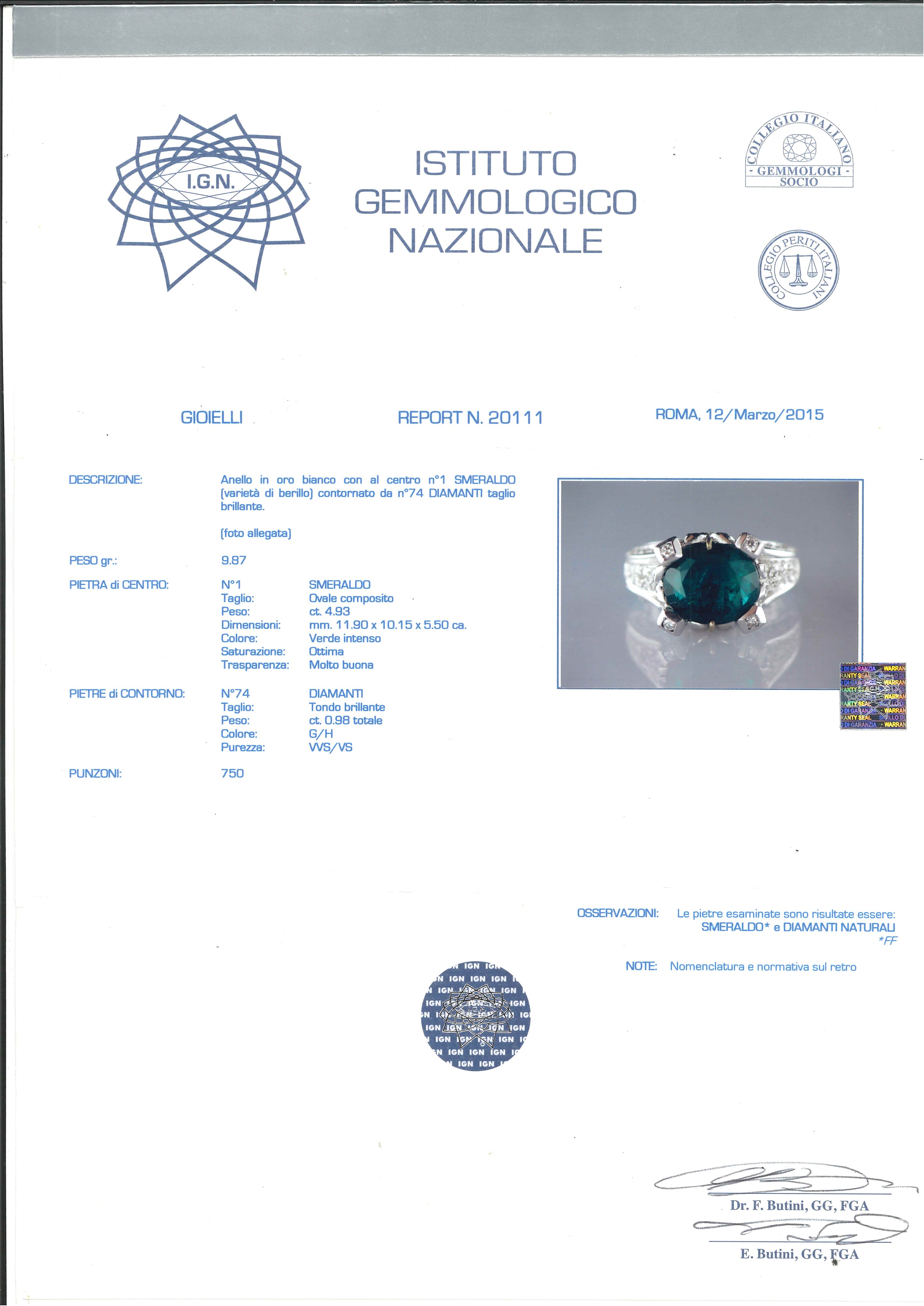 L'anello è accompagnato da certificato gemmologico n. 20111 del 12/03/2015, IGN Roma.