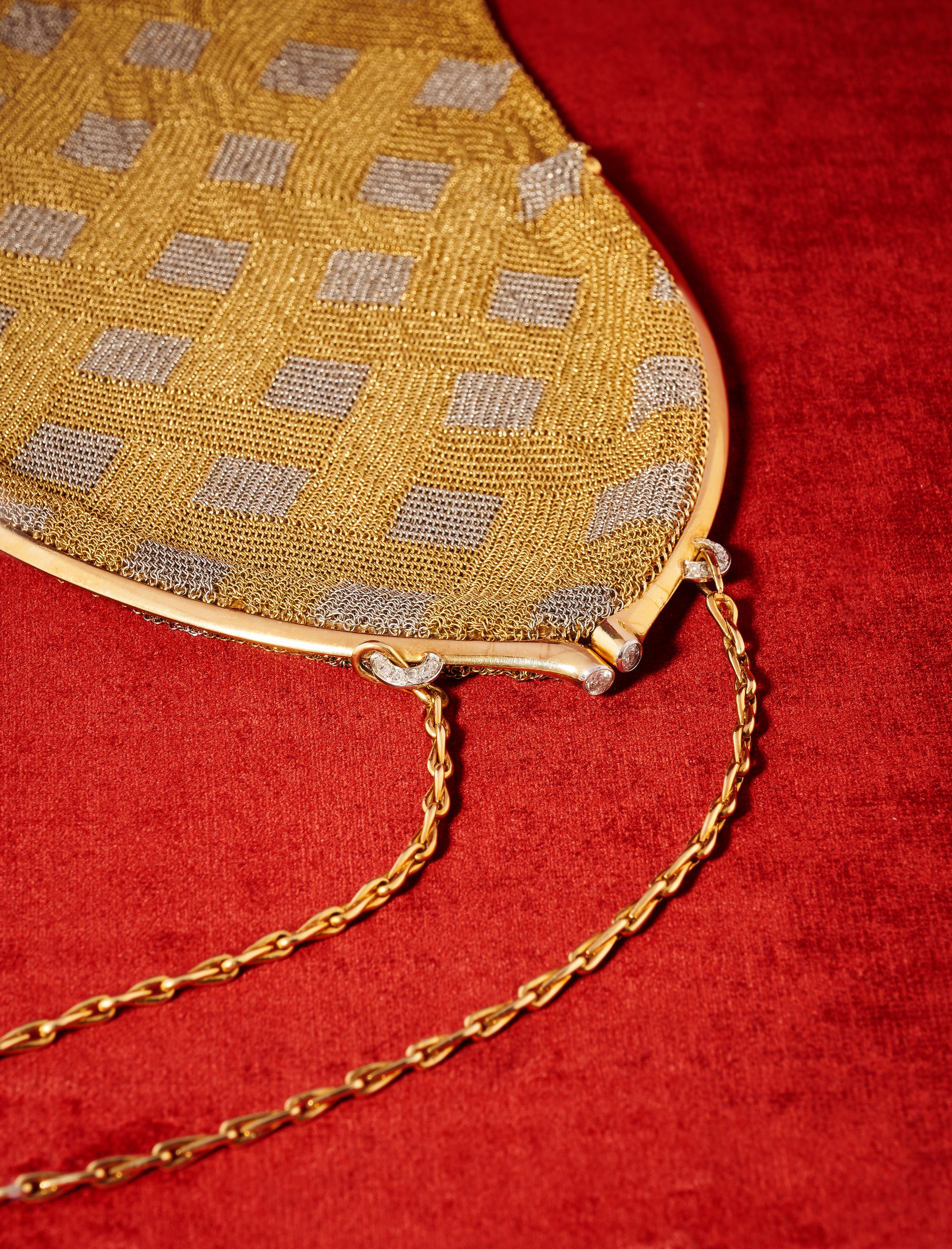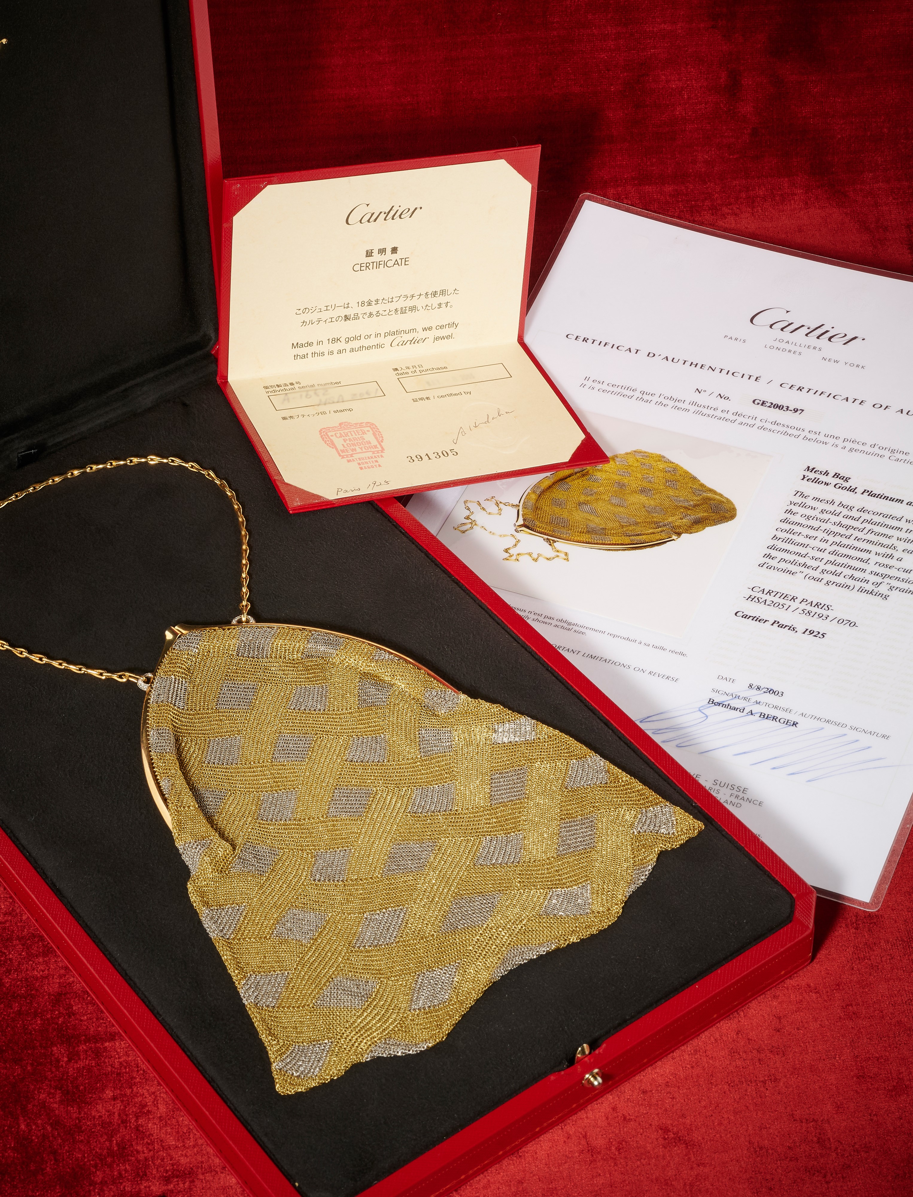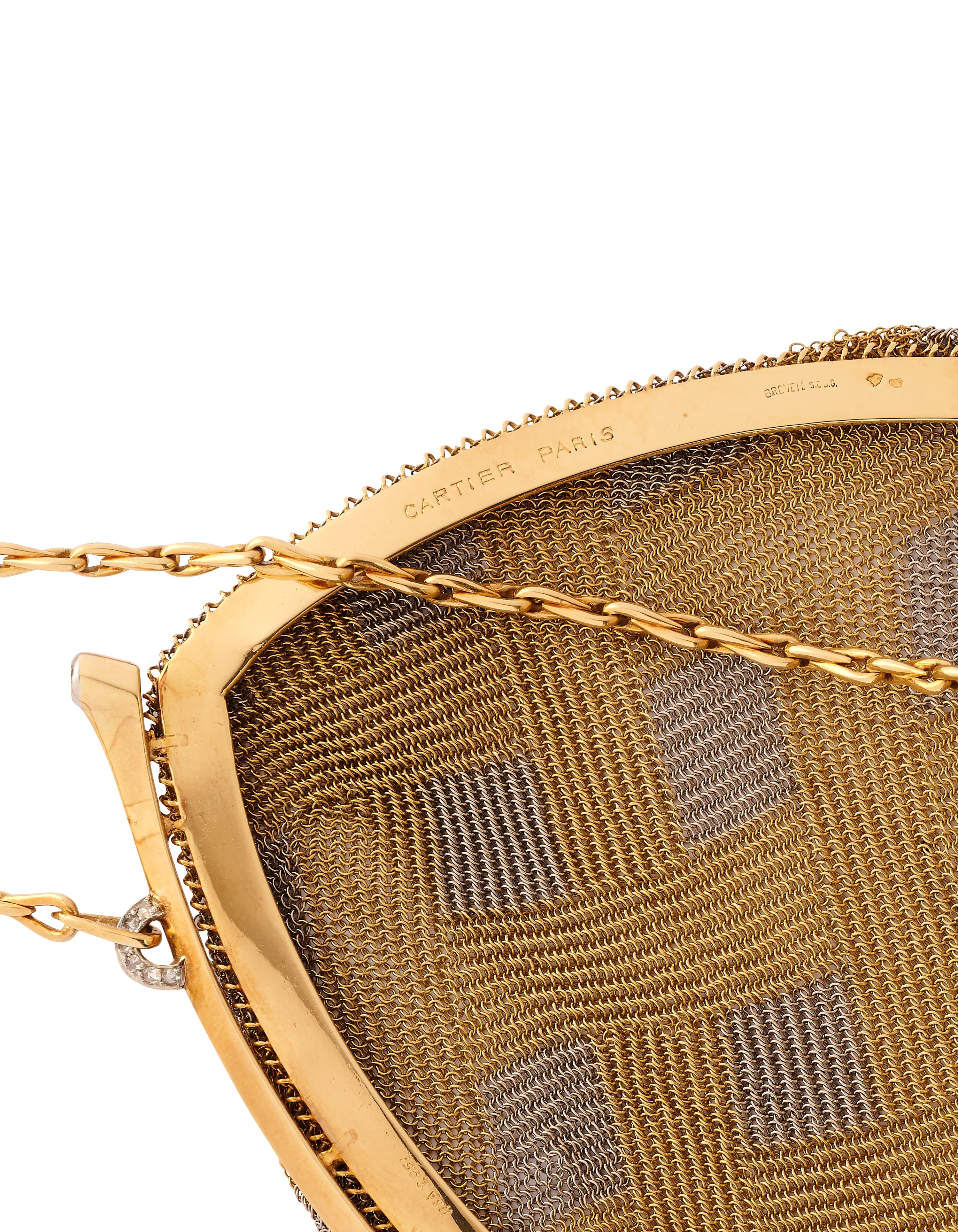 in oro giallo 18k e platinocon disegno a scacchiera, motivo ad intreccio in oro e platino, chiusura a scatto di forma ovale con due terminali in diamanti taglio brillante incastonati in platino, la catena in oro lucido con maglia "grain d'avoine" (grani d'avena) è trattenuta da due anelli di sospensione in platino incastonati in diamanti taglio rosa, firmata, numerata e punzonata Cartier, Paris, con scatola e controscatola.