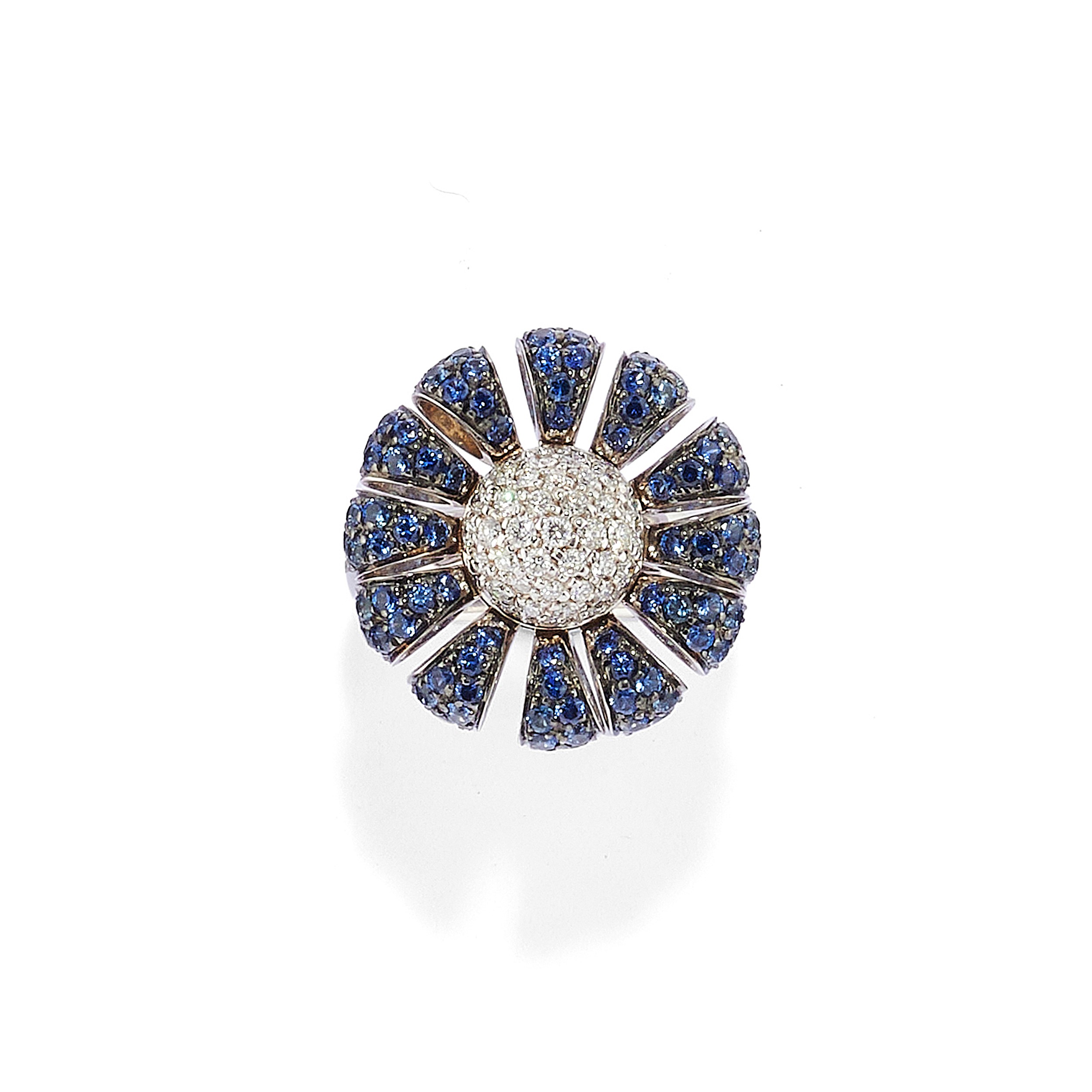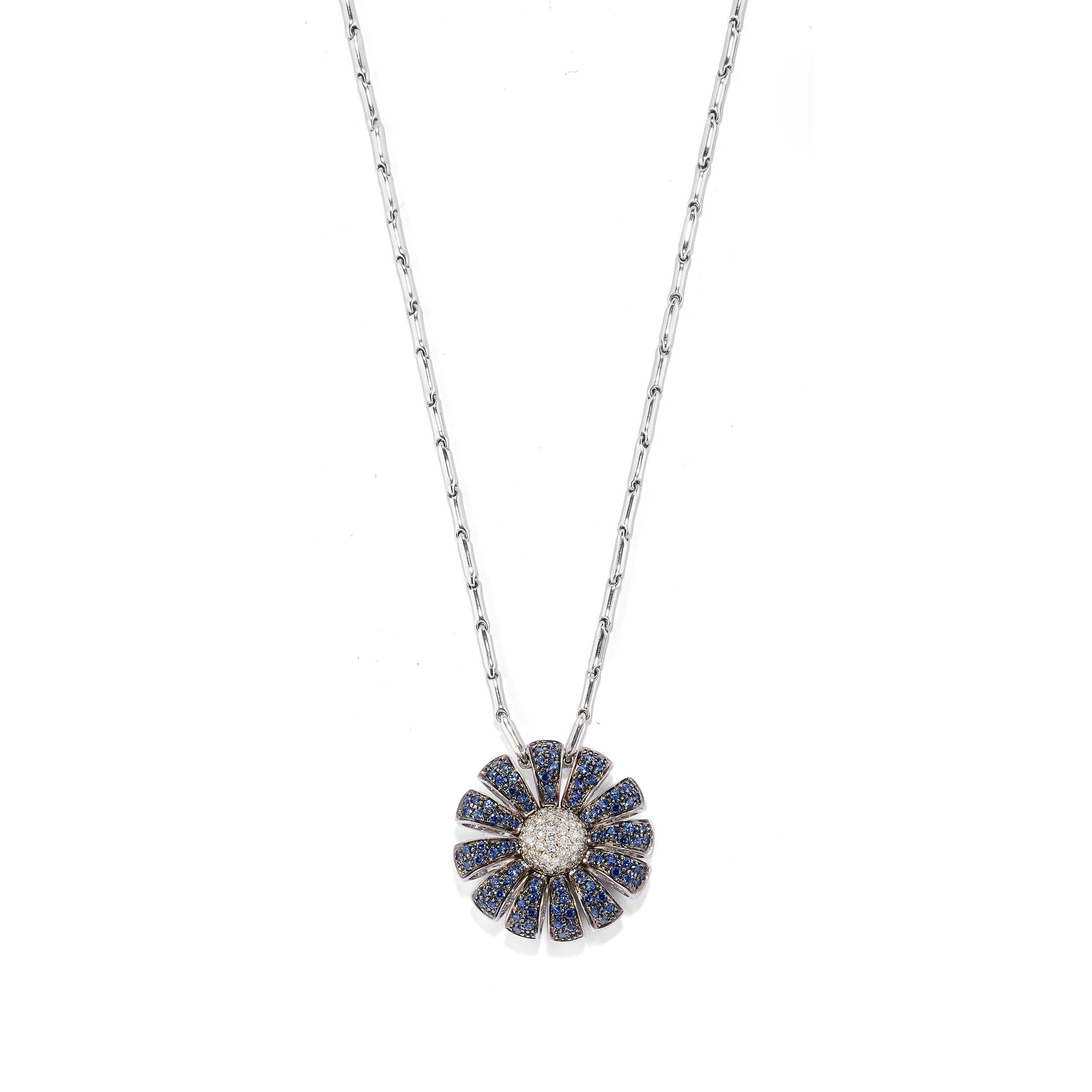 composta da collana ed anello a margherita con petali mobili in zaffiri taglio rotondo e al centro diamanti taglio brillante.