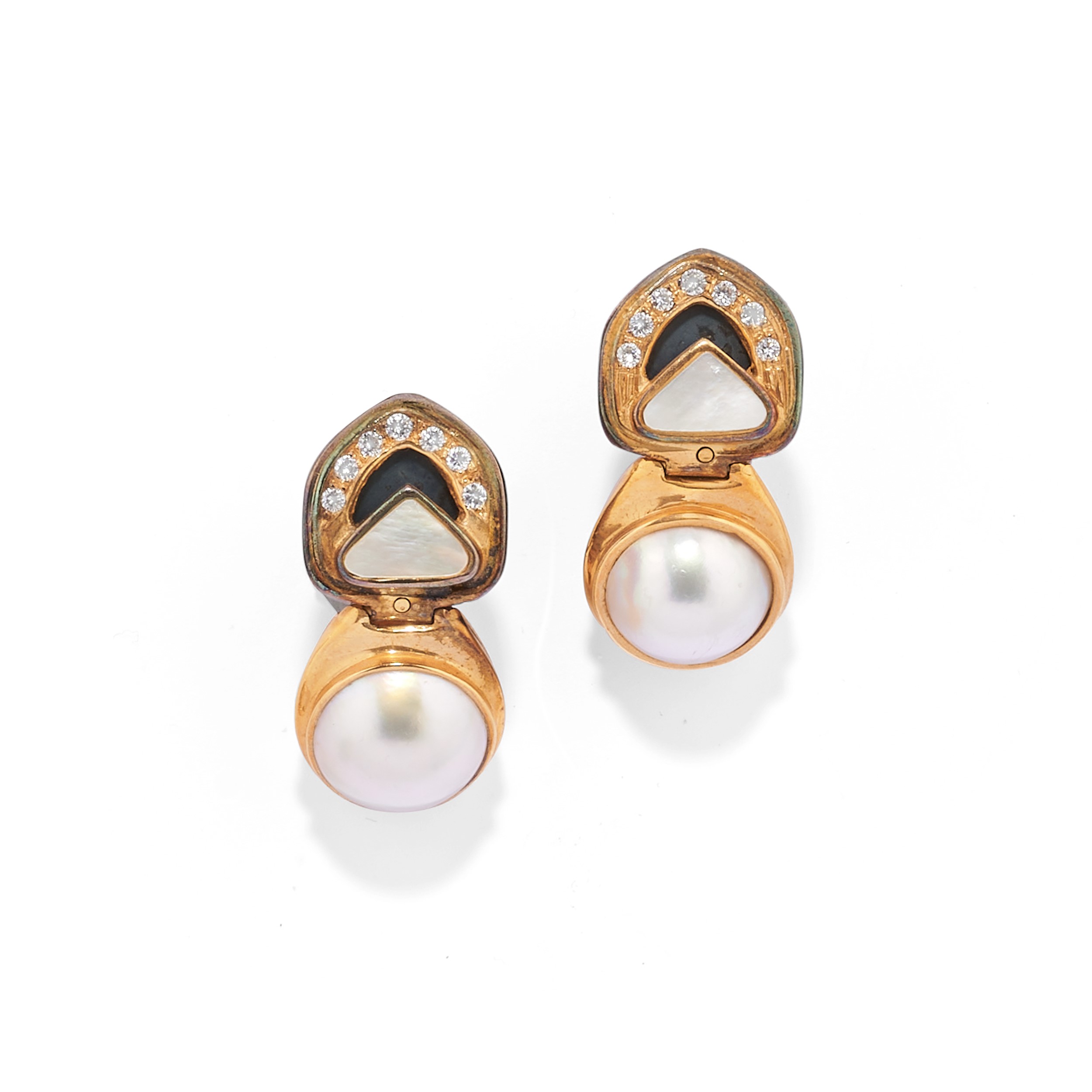 in oro giallo 18kcomposta da collana girocollo con maglia elastica, motivi rettangolari decorati da diamanti taglio brillante per totale ct 5,00 circa e madreperla grigia alternati a motivi con perle mabè, interno con molla in acciaio, e orecchini con motivo in diamanti taglio brillante per ct 0,30 circa e madreperla bianca che trattiene pendente snodato decorato con perla mabè, chiusura perno e clip.